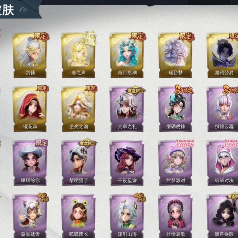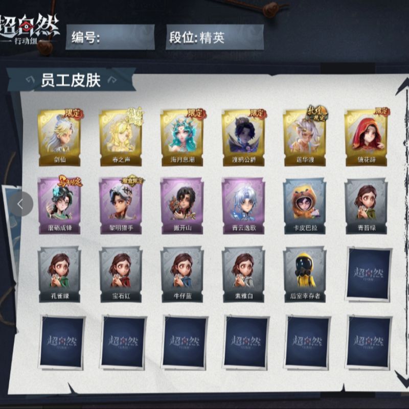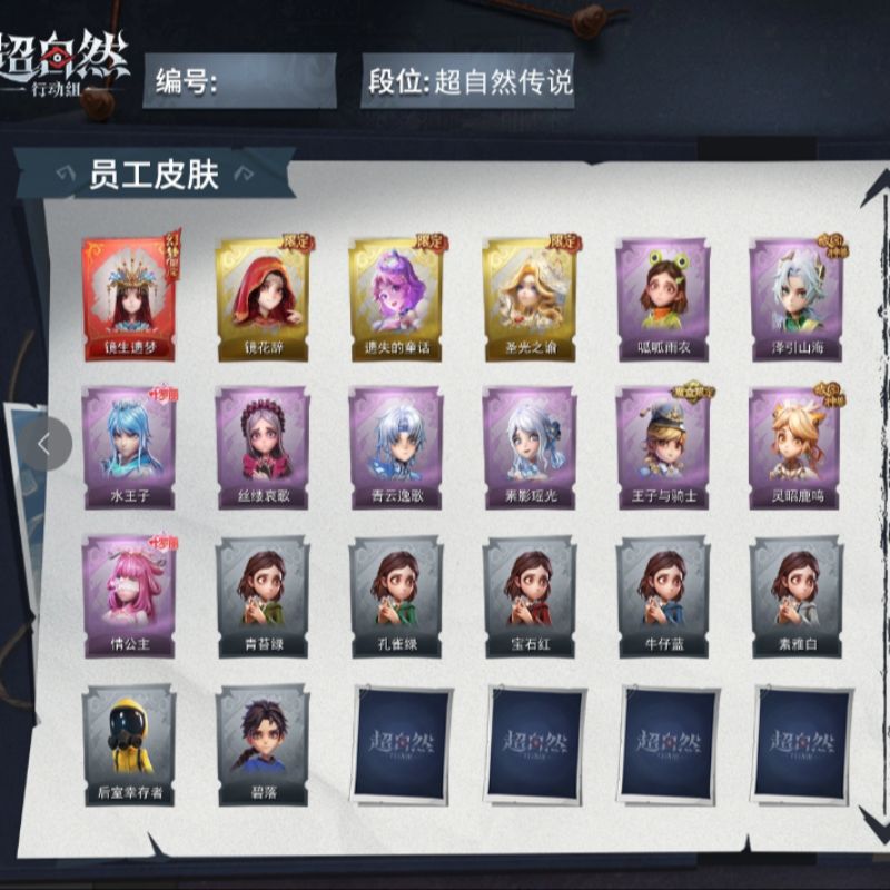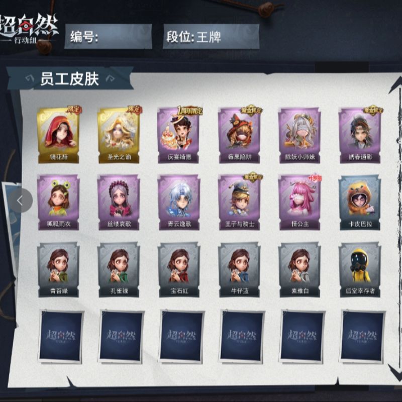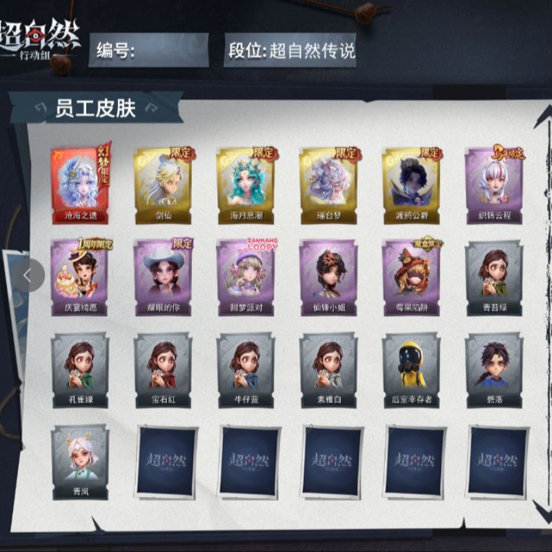 ZR771,金皮:1,紫皮:8,道具皮:16,员工:小黄、爱丽丝、零、阿念、逍遥、薇薇安、巫铃儿、莉莉、艾伦、爱德华、兰、小满、临云,服装:兰-春之声、艾伦-黎明猎手、阿念-庆宴绮愿