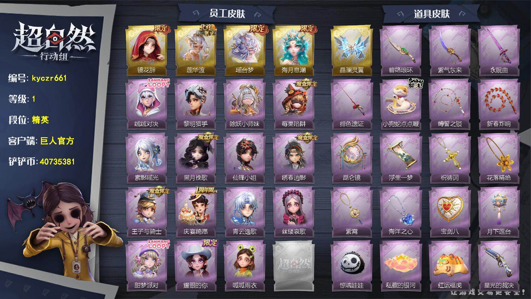 ZR774,金皮:1,紫皮:9,道具皮:37,员工:小满、临云、小黄、爱丽丝、零、阿念、逍遥、薇薇安、巫铃儿