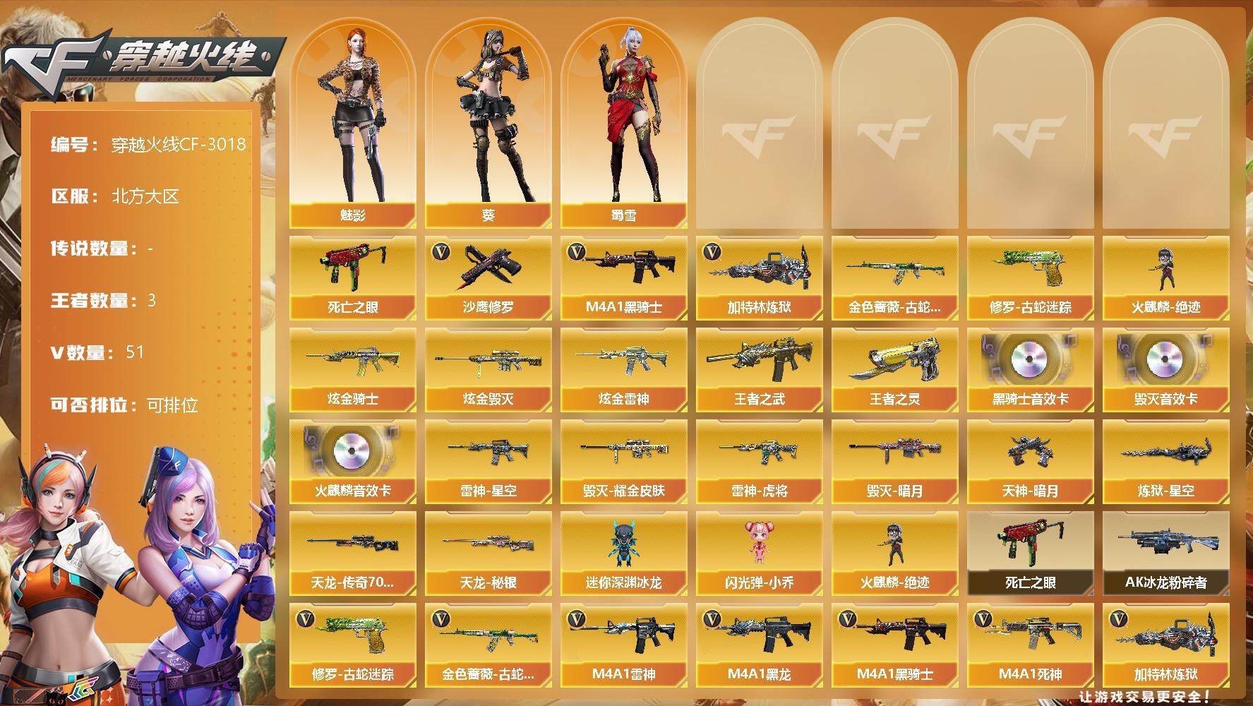穿越火线(CF)【端游】北方大区-51V-3王者-5炫金 【热门武器】:金色蔷薇-古蛇迷踪,修罗-古蛇