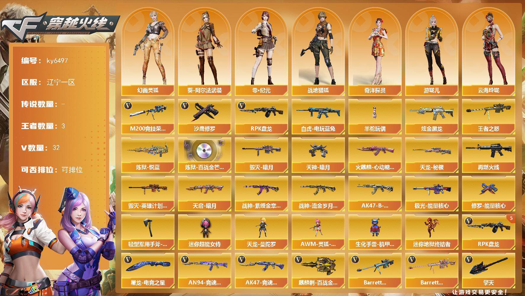 辽宁一区-33V-3王者武器数-1炫金武器数【热门武器】:M200-竞技荣光