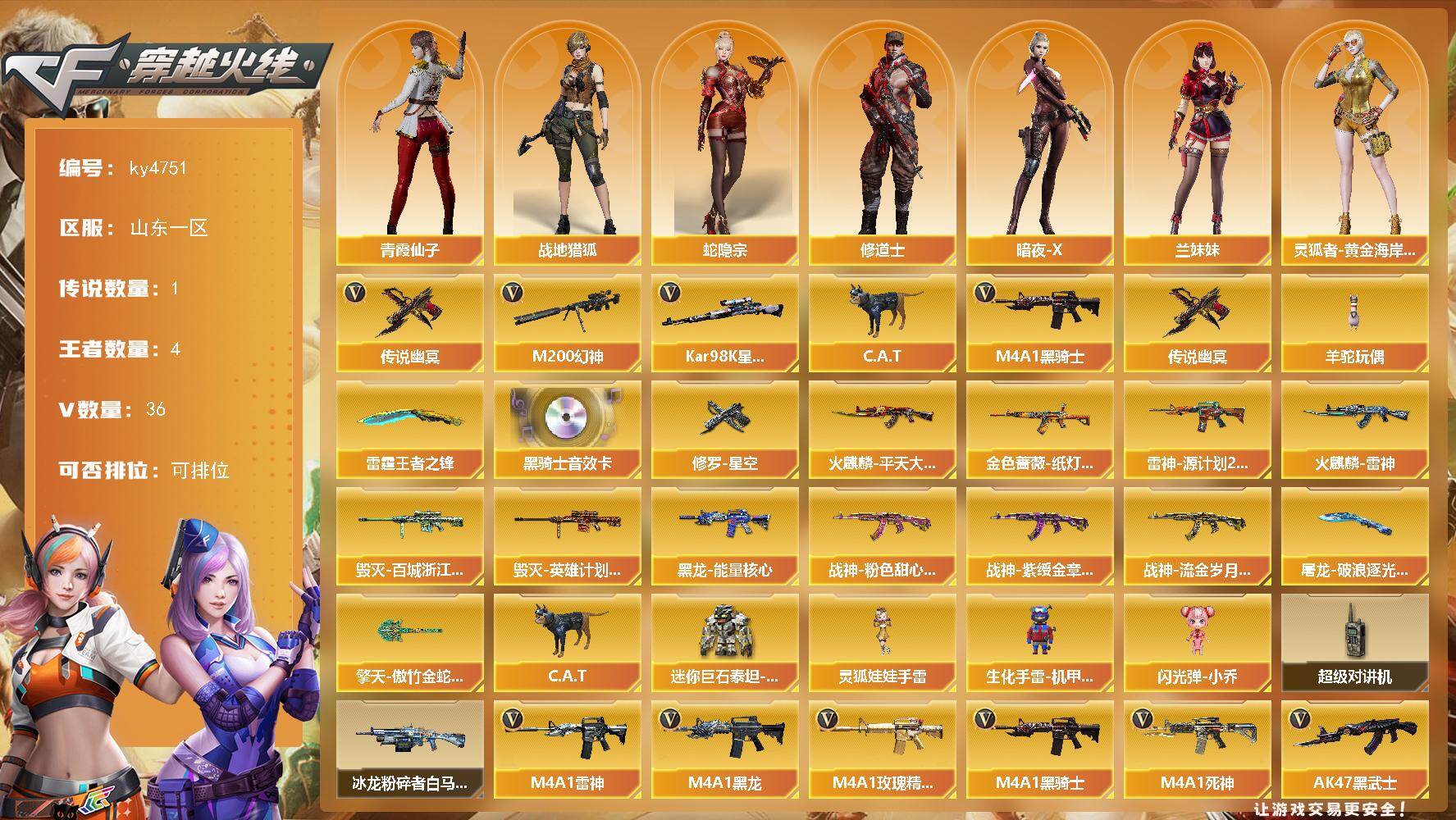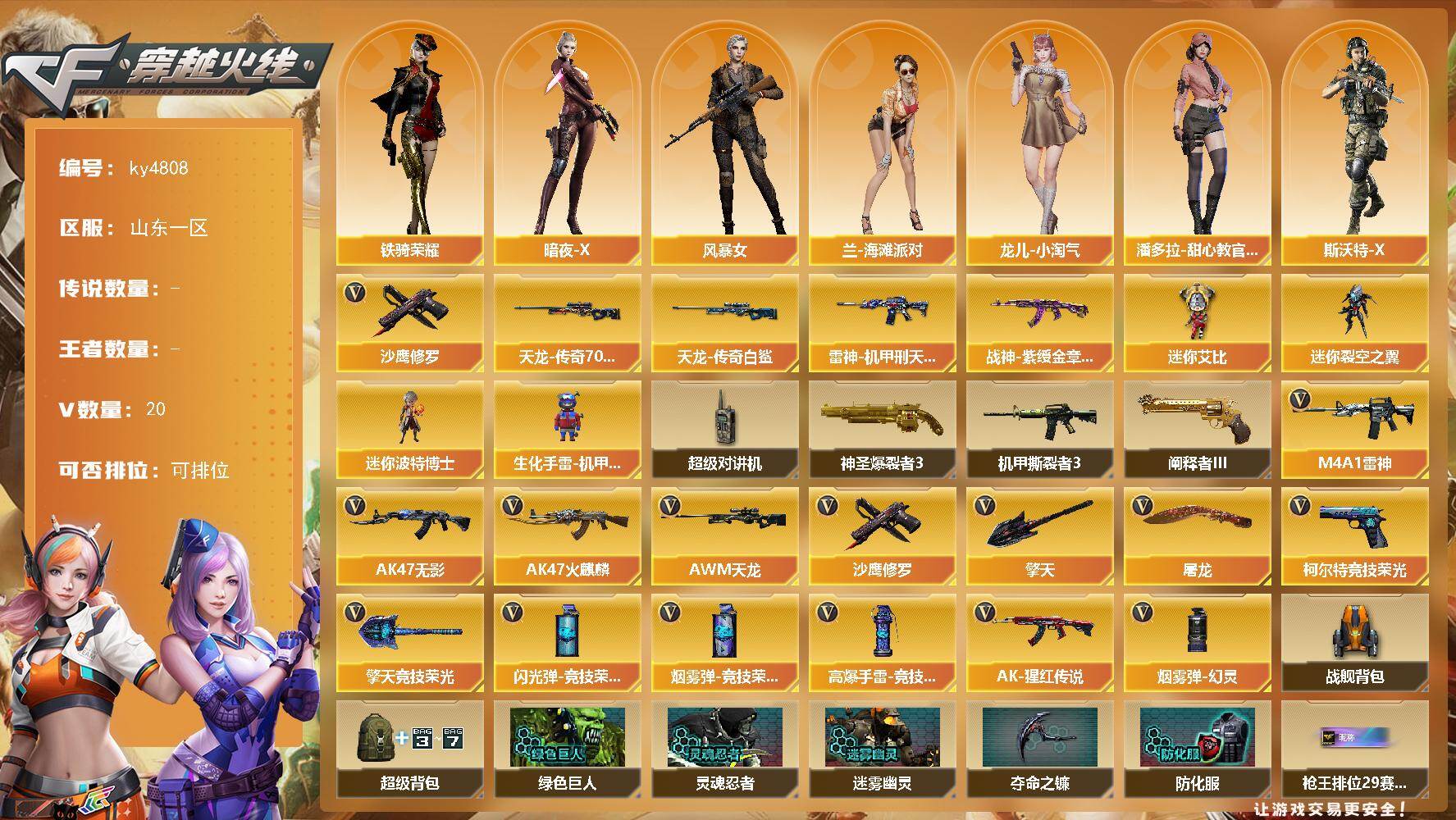 山东一区-20V-0王者-0炫金【热门武器】:沙鹰-修罗*2【皮肤】:雷神