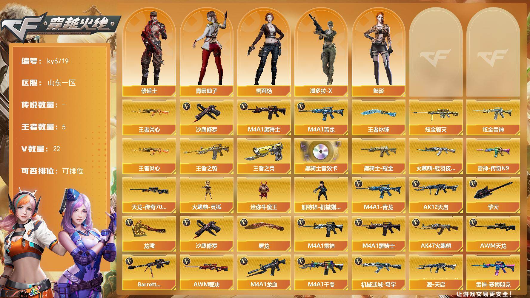 山东一区-22V-5王者武器数-4炫金武器数【热门武器】:M4A1-青龙,