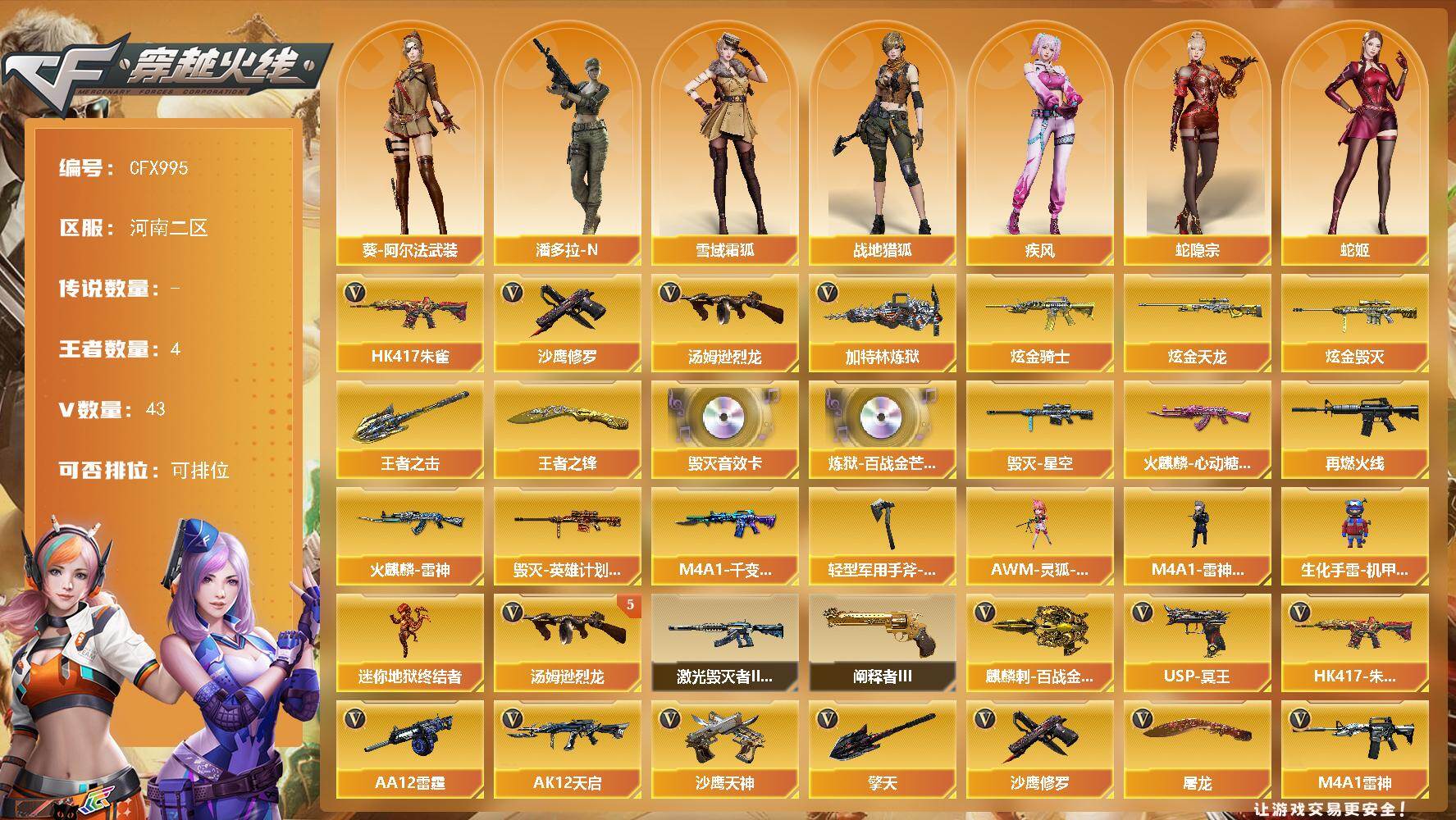 河南二区-42V-4王者武器数-8炫金武器数【热门武器】:HK417-朱雀