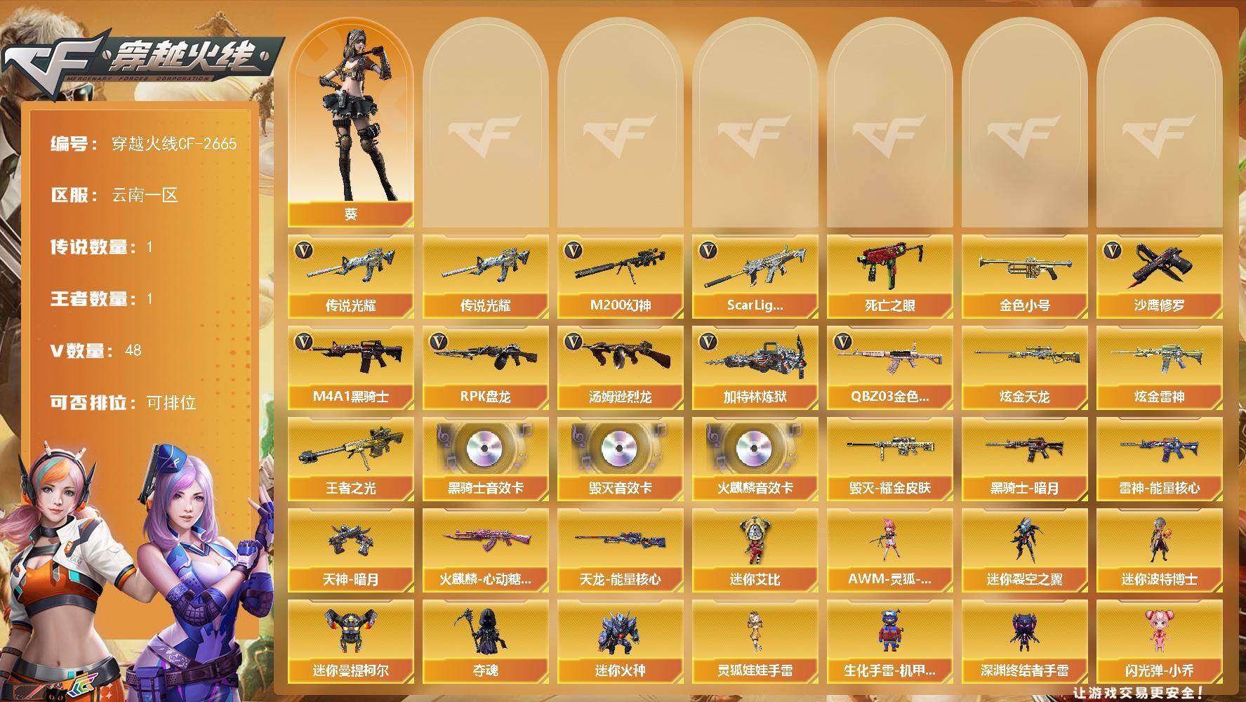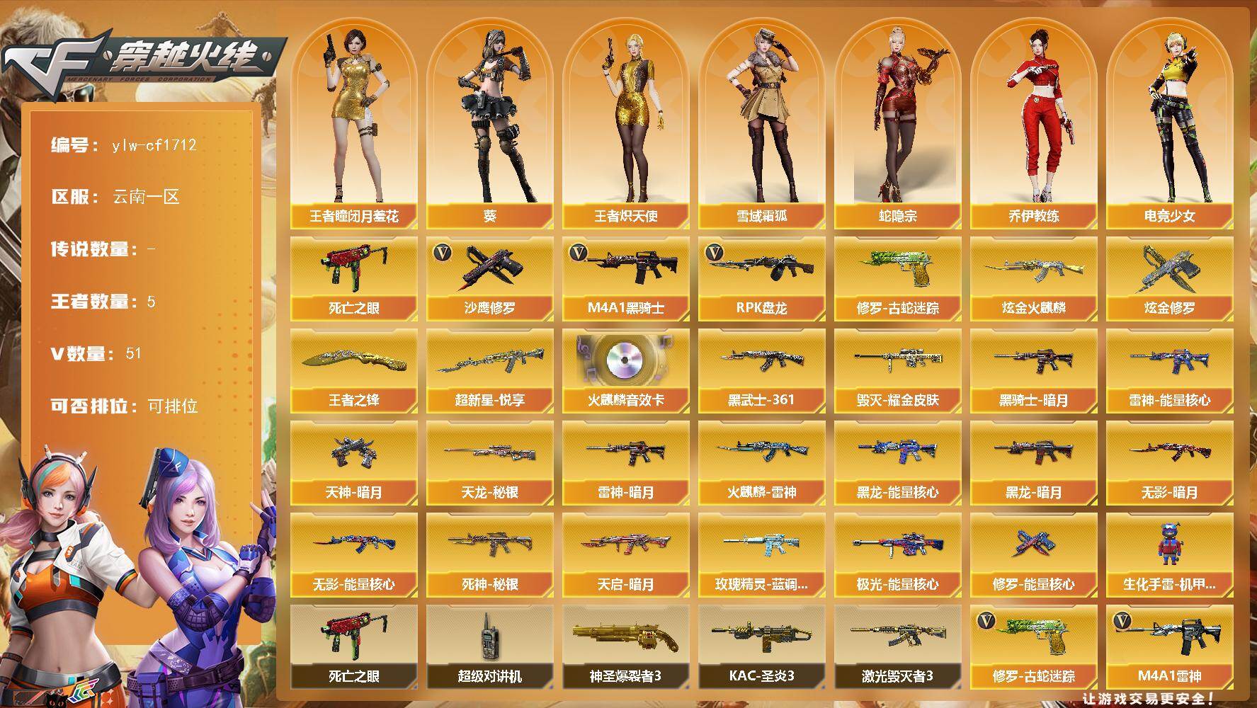 云南一区-51V-5王者-3炫金【热门武器】:修罗-古蛇迷踪,死亡之眼*4,