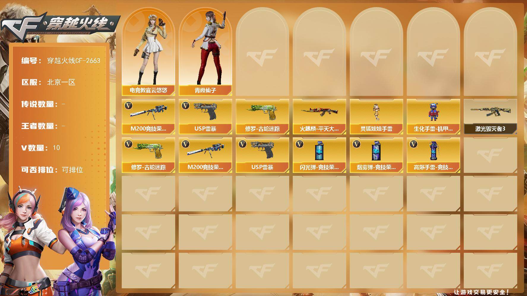 【商品标题】:北京一区-10V-0王者-0炫金【热门武器】:修罗-古蛇迷踪,