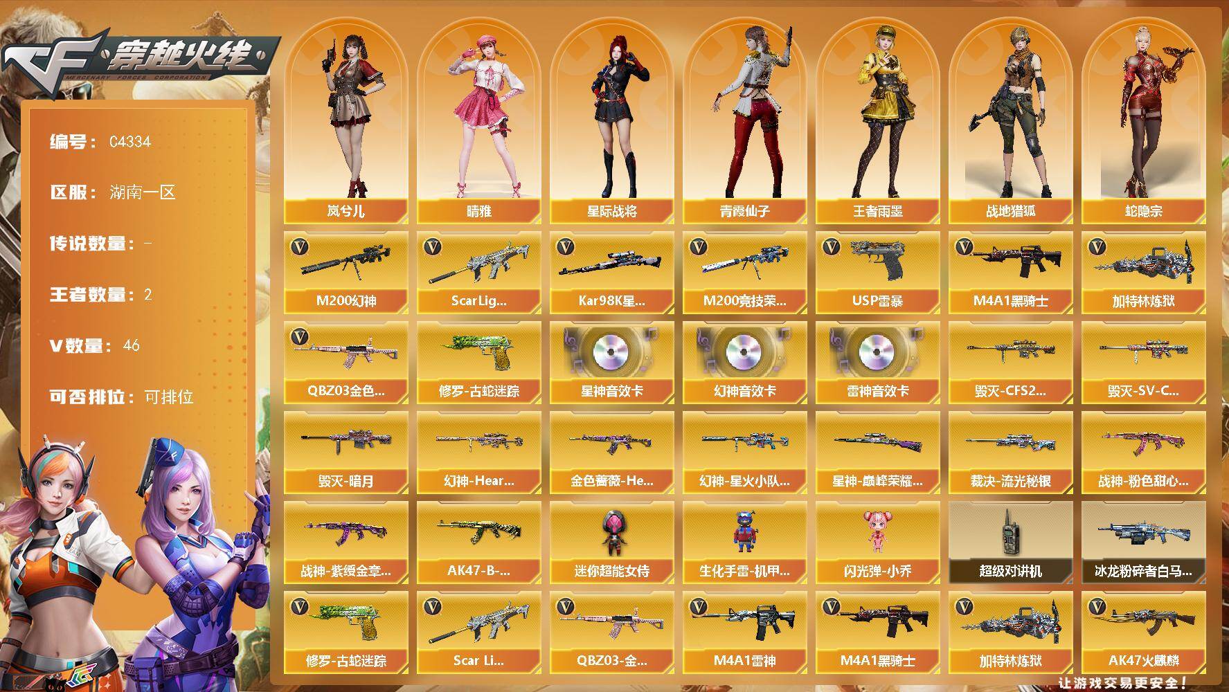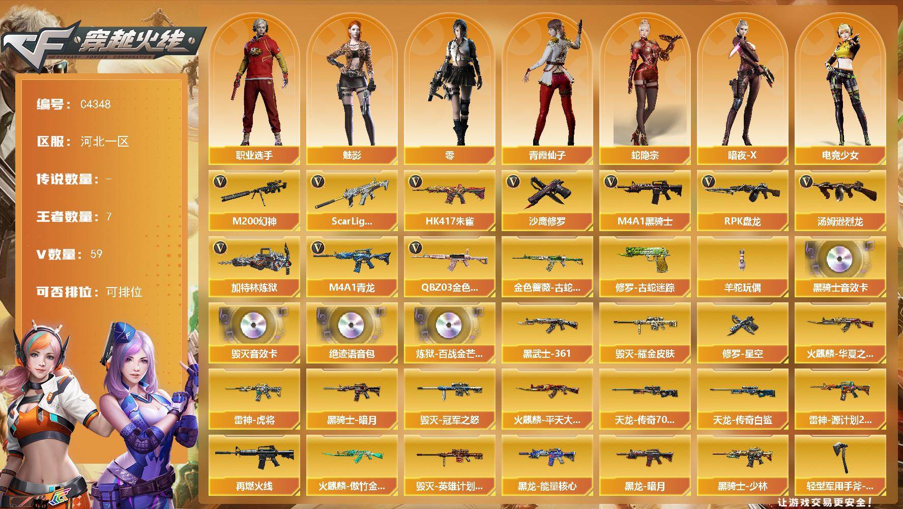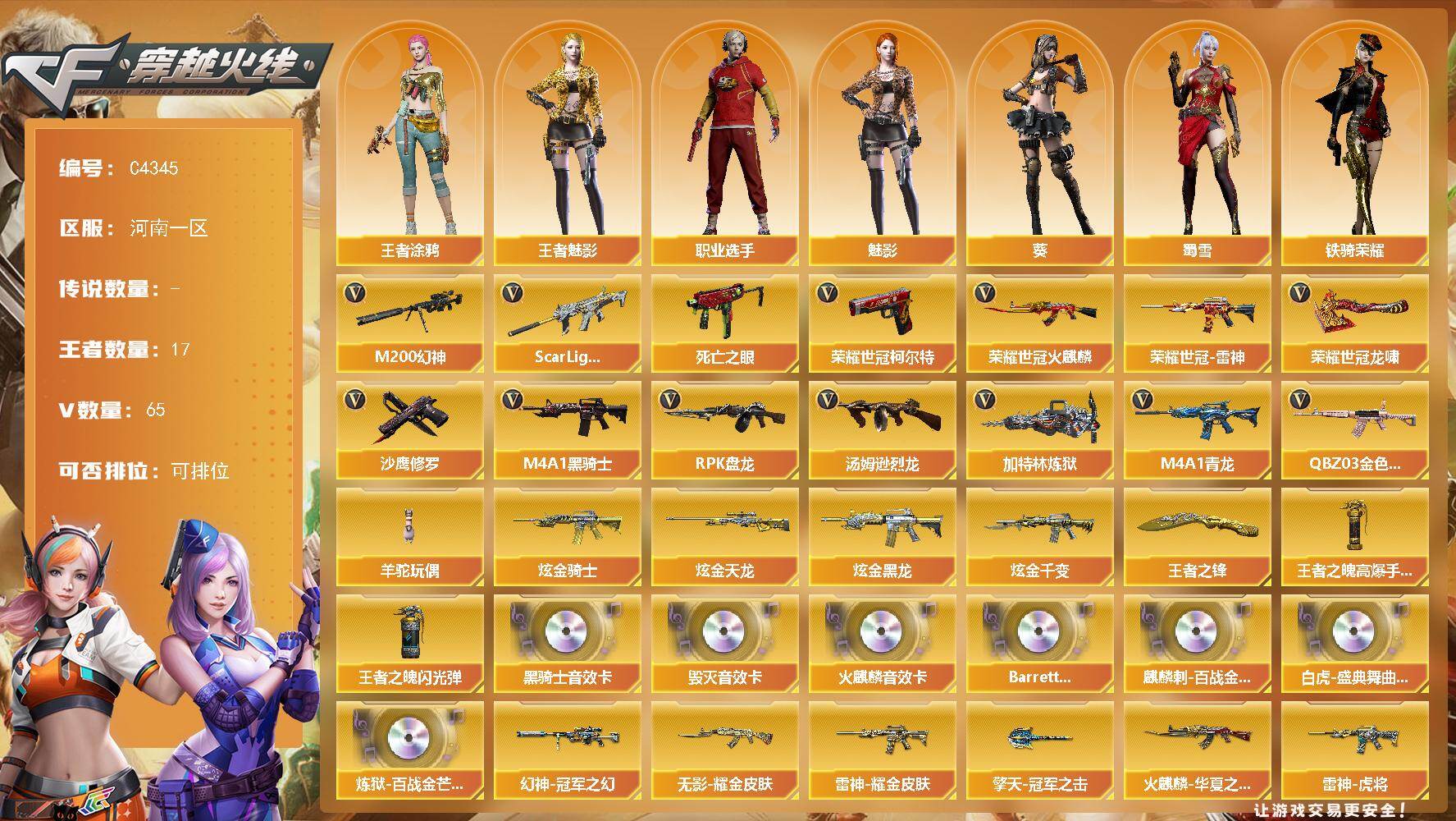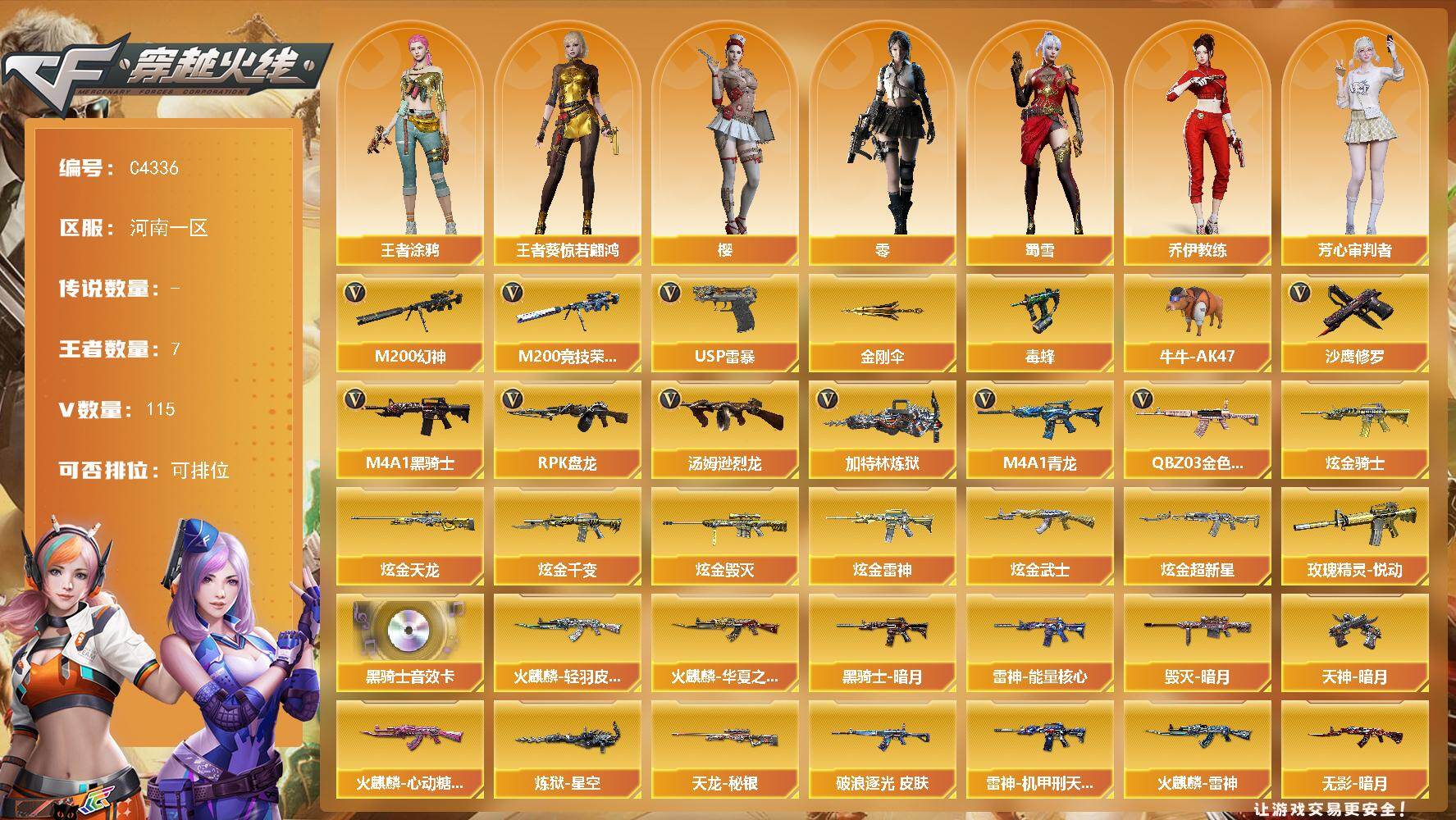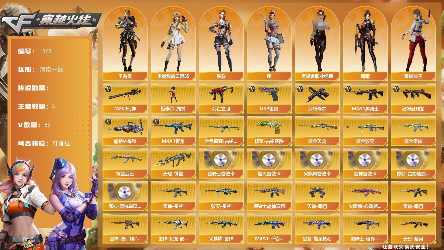 河南一区-86V-5王者-4炫金【热门武器】:M4A1-青龙,M200-幻神