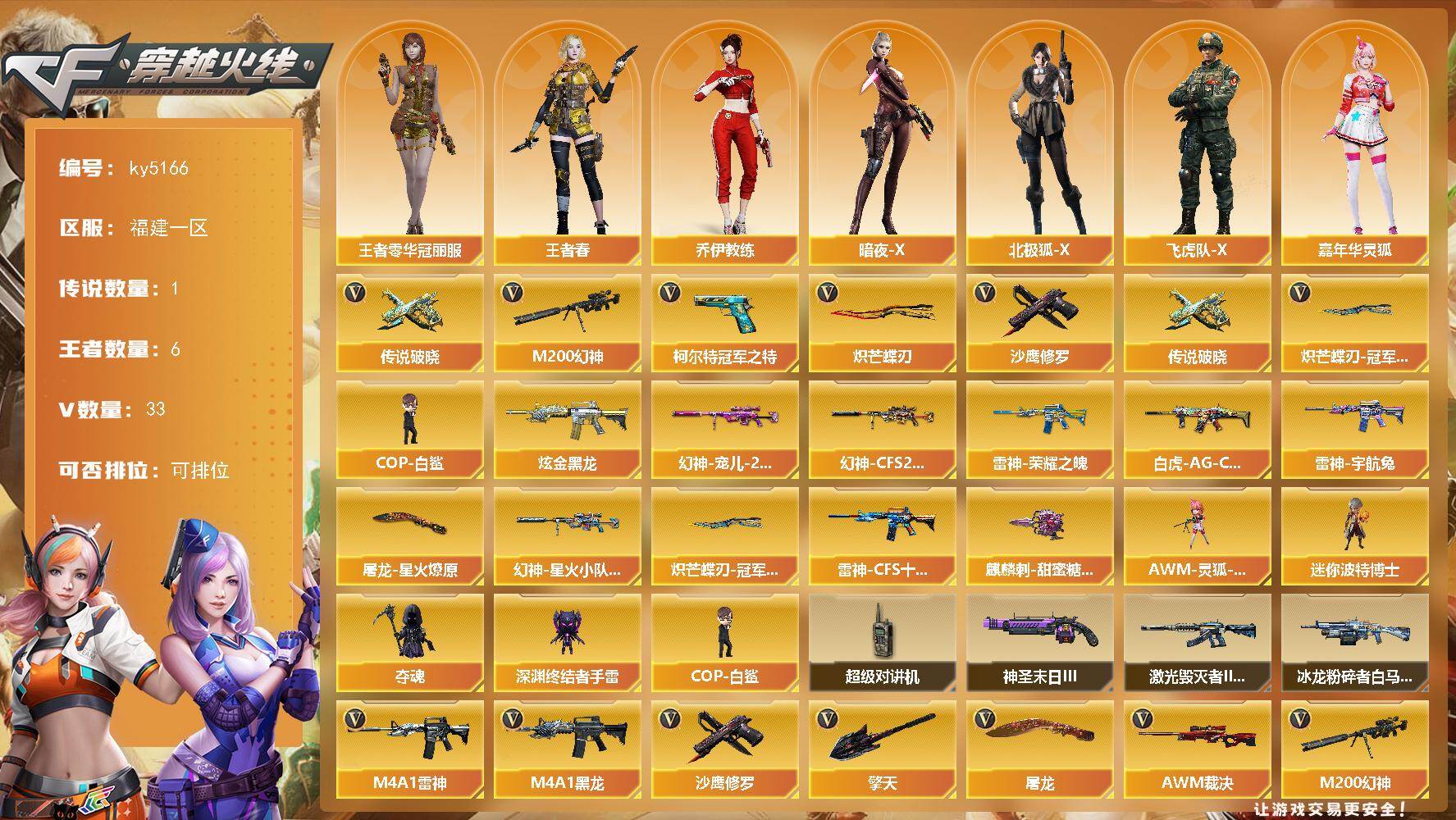 福建一区-33V-6王者-1炫金【传说武器】:传说破晓【热门武器】:传说破
