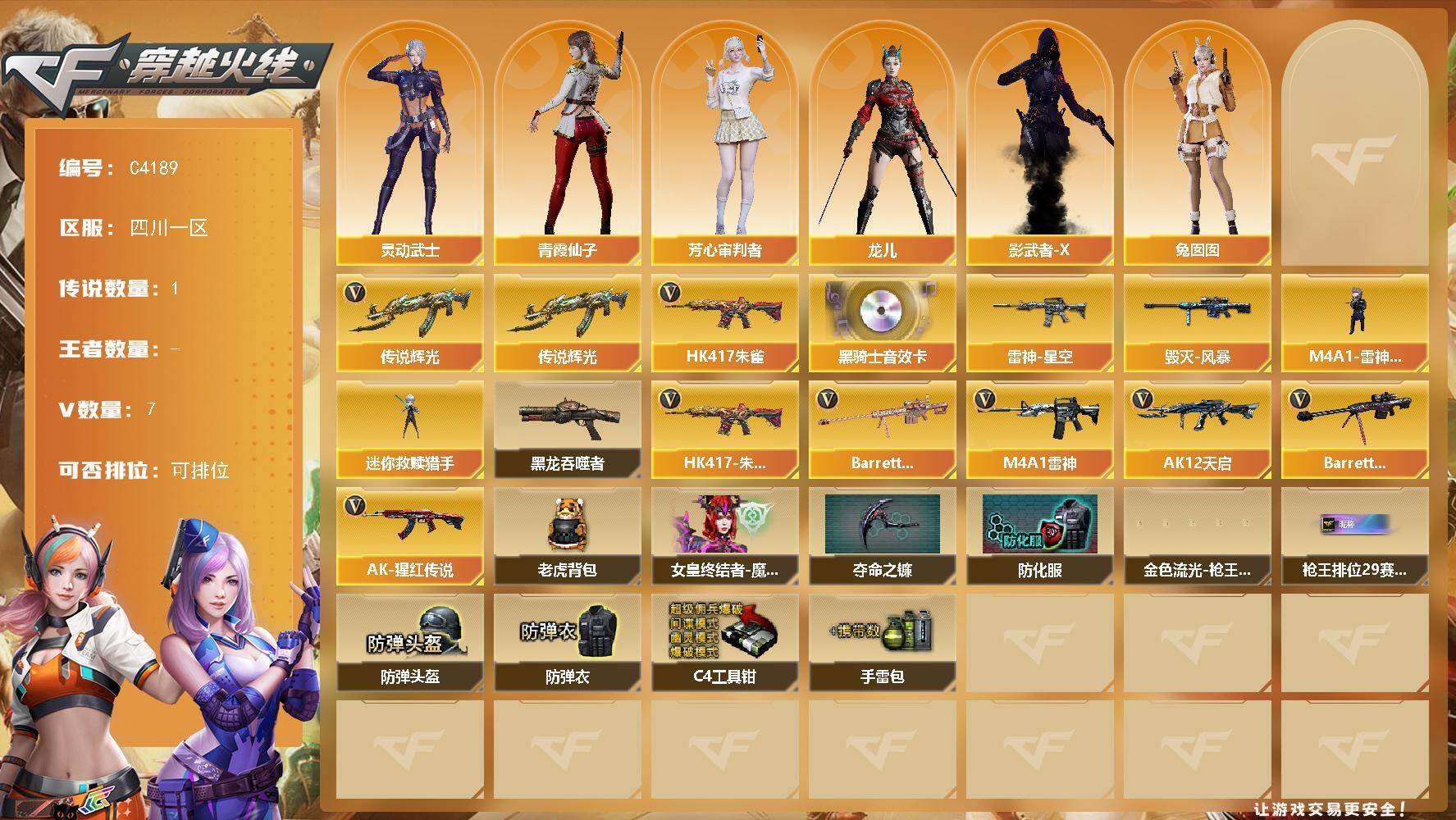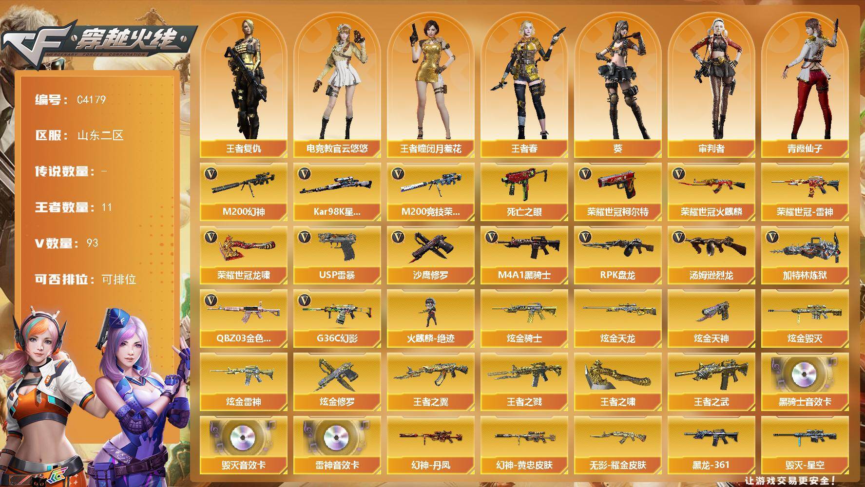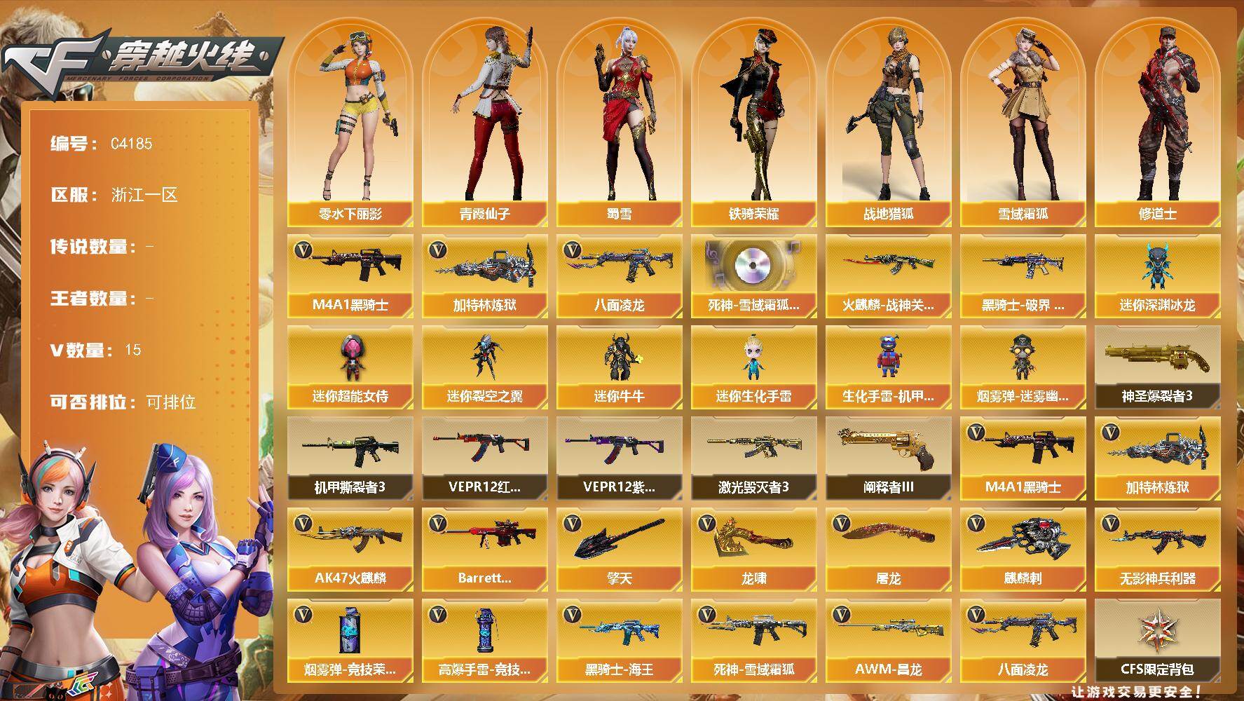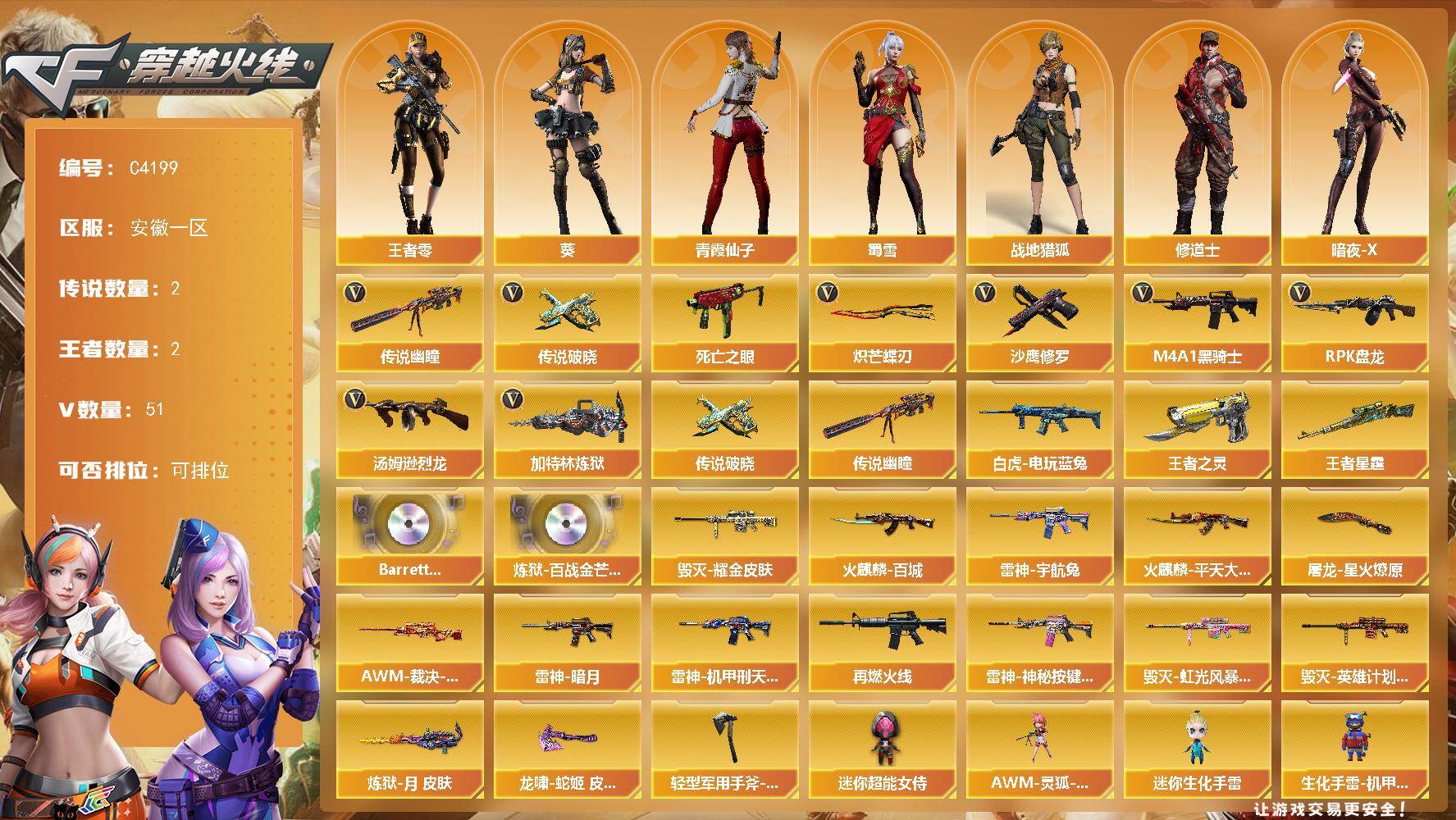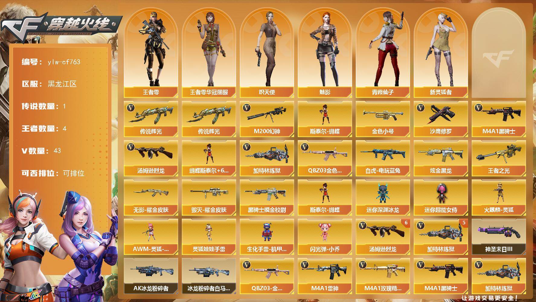 传说灵眸,王者星霆,王者方薇,白虎。各种神器手雷应有尽有,排位正常,具体看图,价格便宜