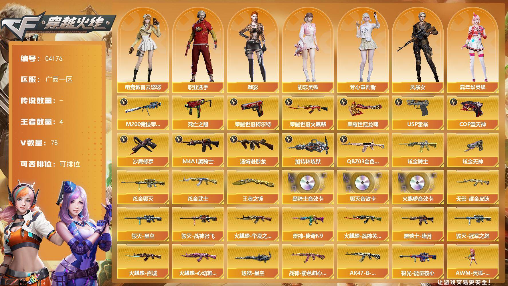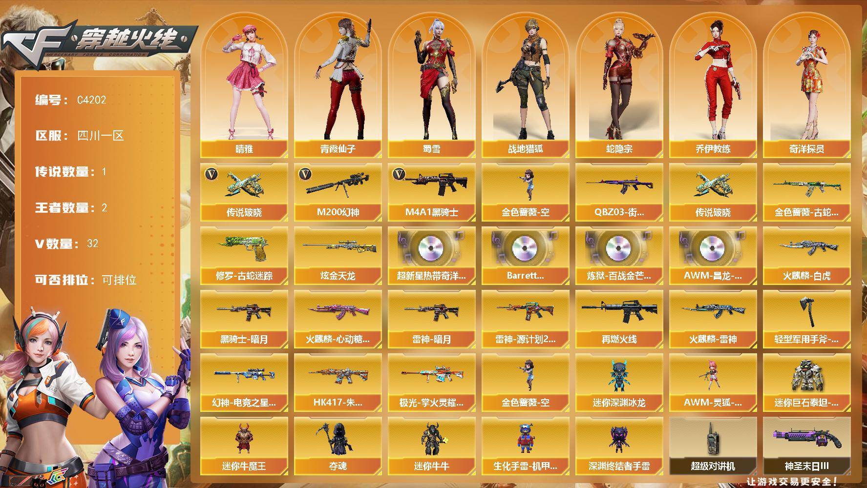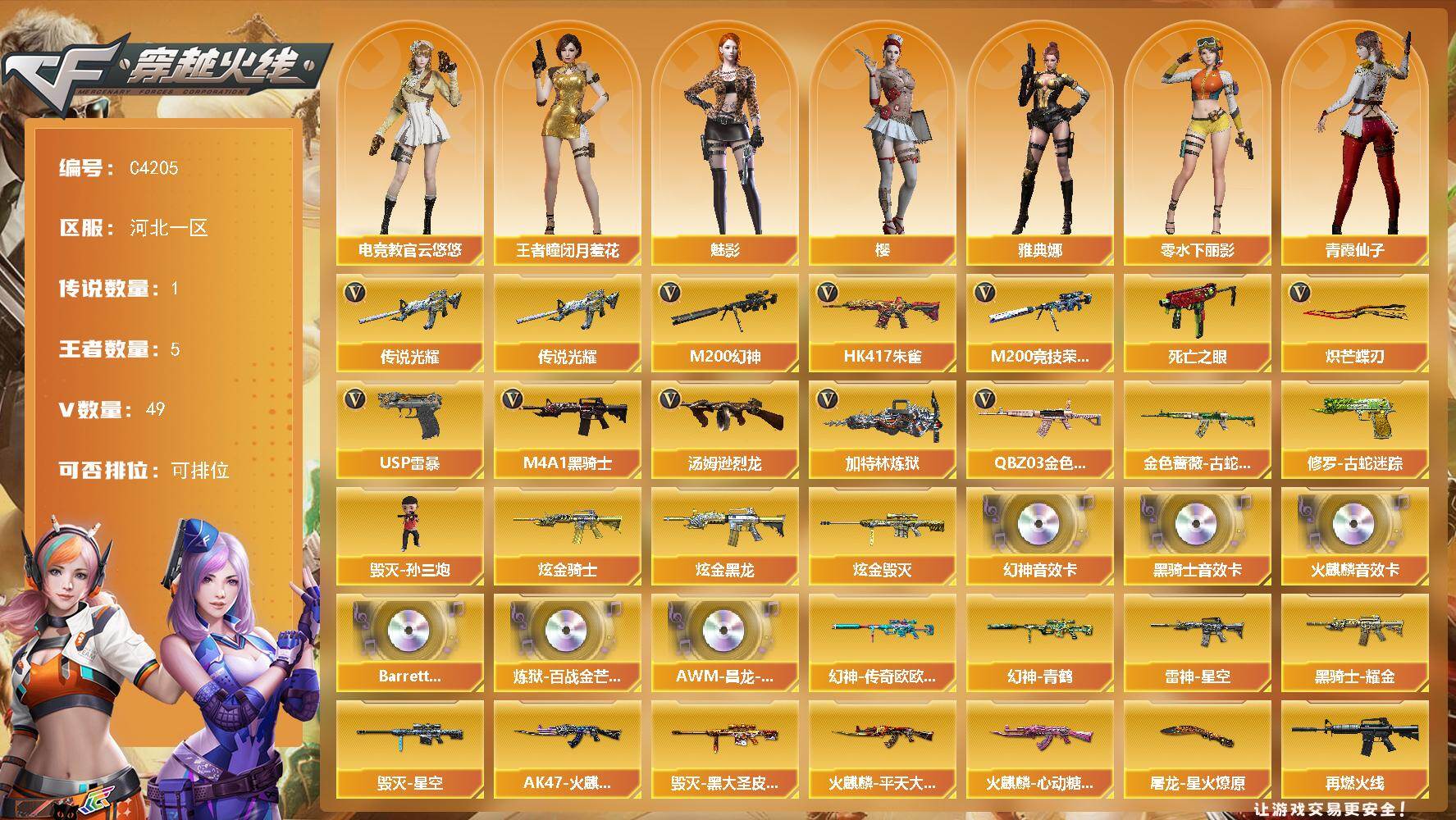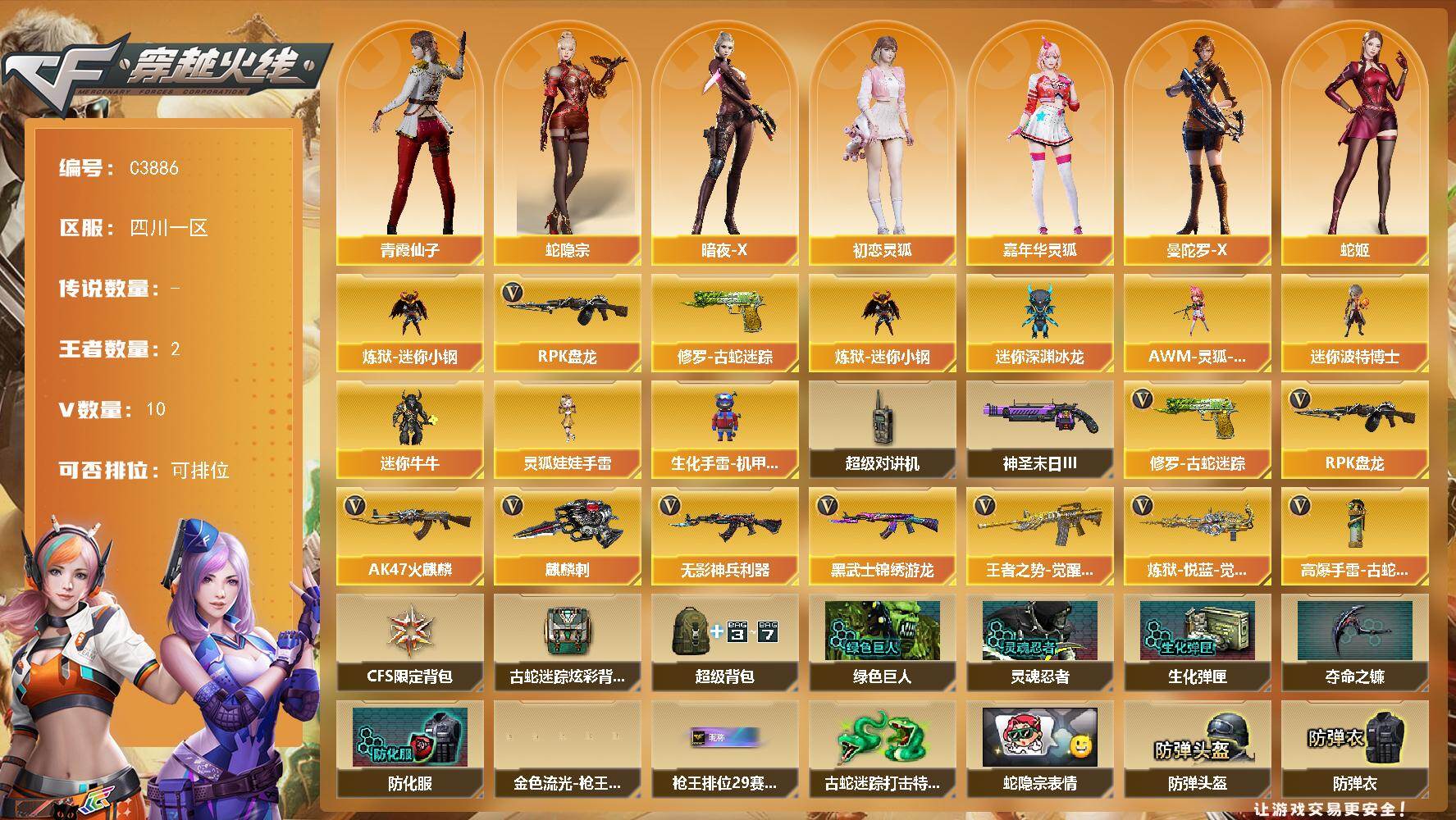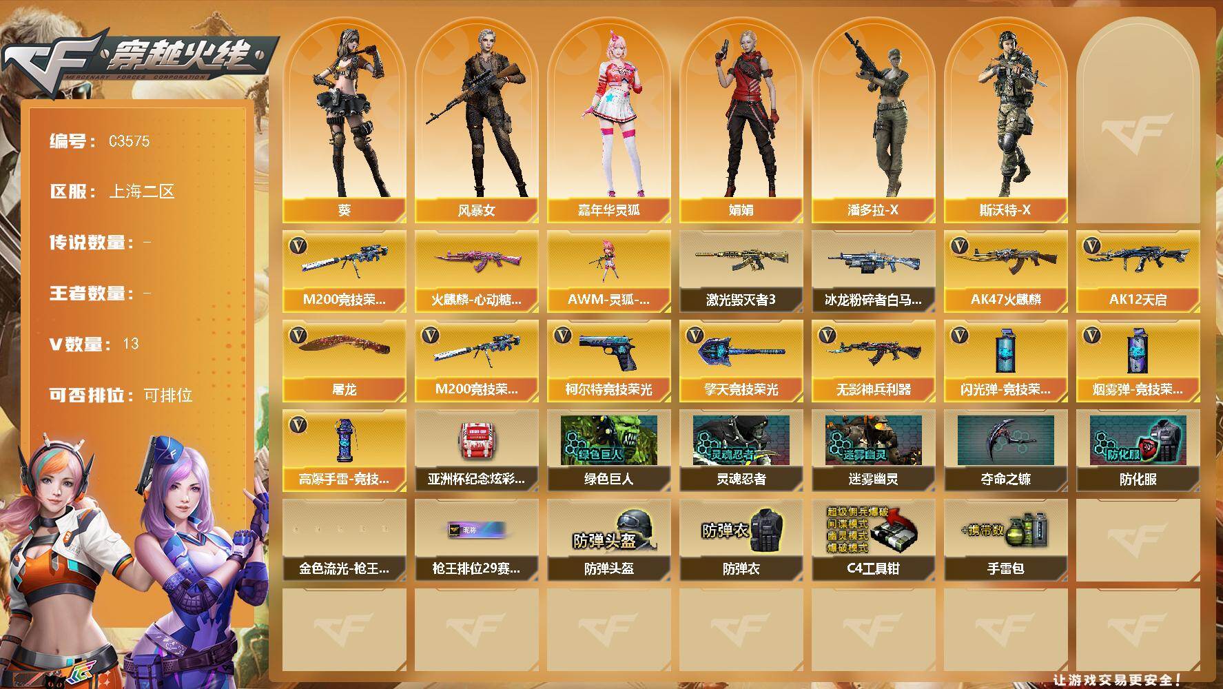 传说灵眸,王者星霆,王者方薇,白虎。各种神器手雷应有尽有,排位正常,具体看图,价格便宜