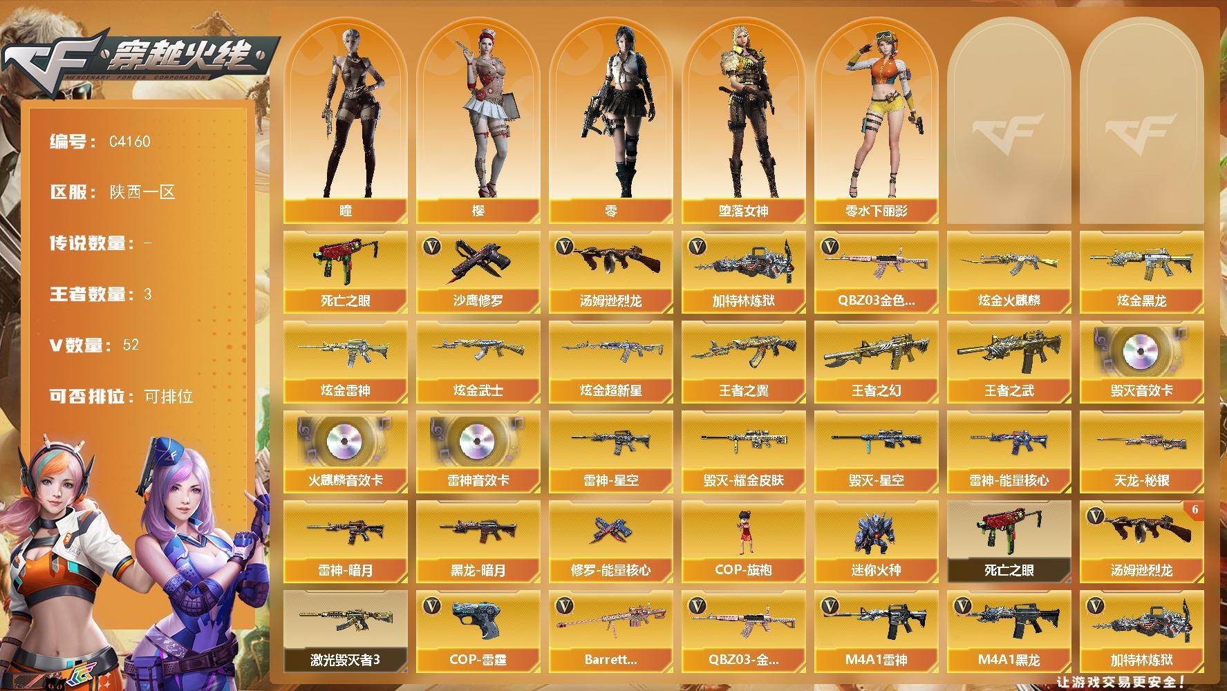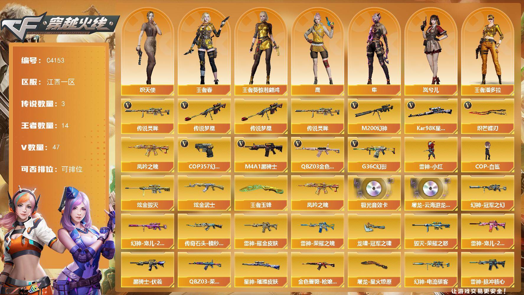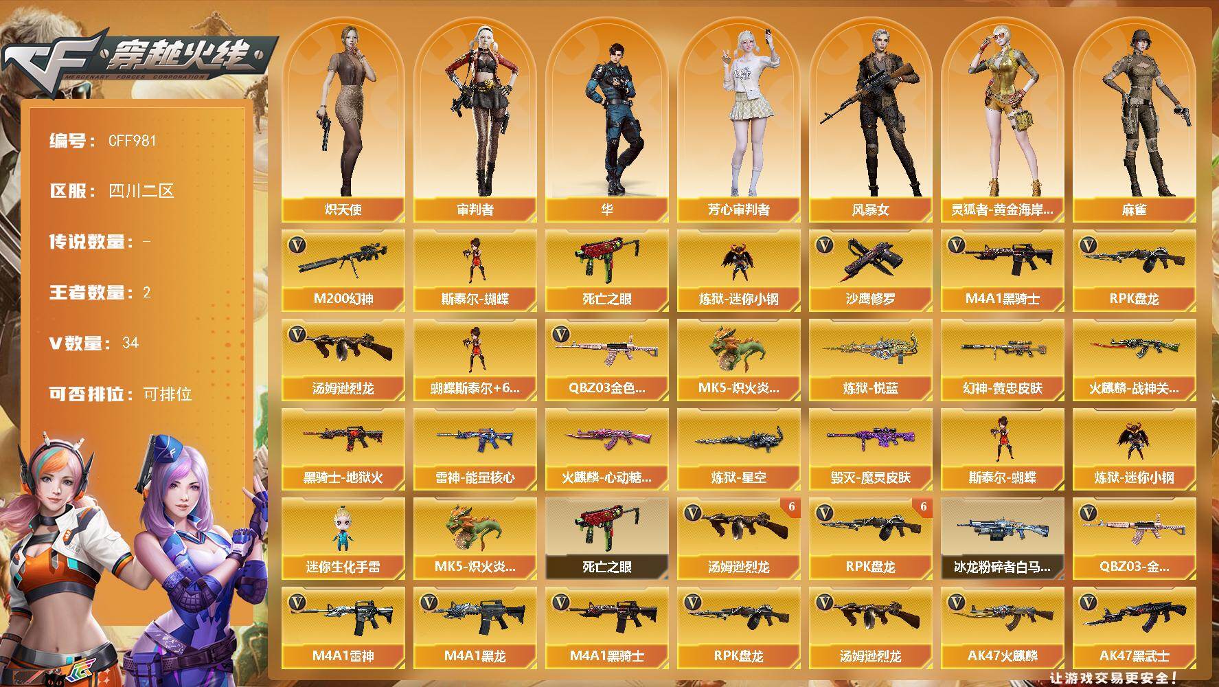 湖南一区-31V-4王者-2炫金【热门武器】:M200-幻神,死亡之眼,白虎