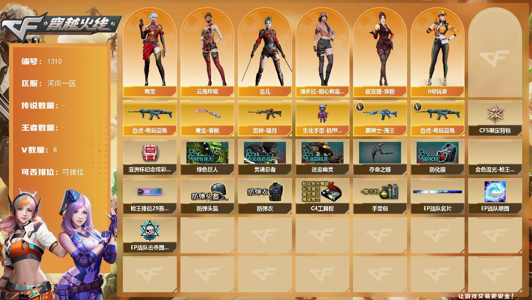 河南一区-8V-0王者-0炫金【热门武器】:白虎-电玩蓝兔【皮肤】:雷神-