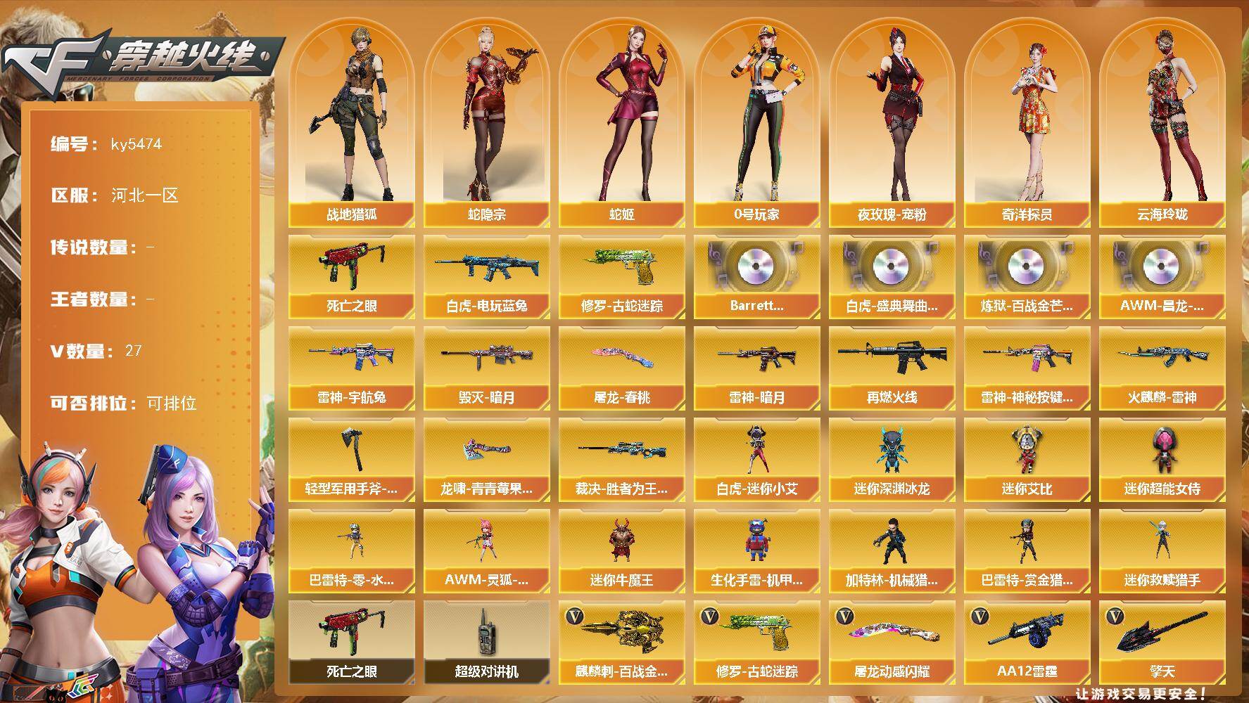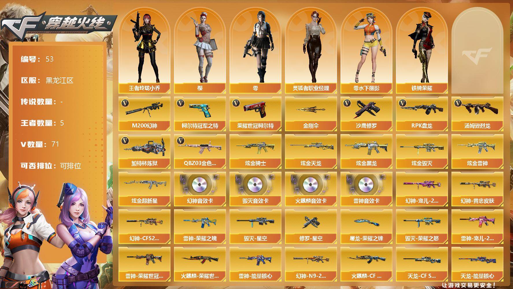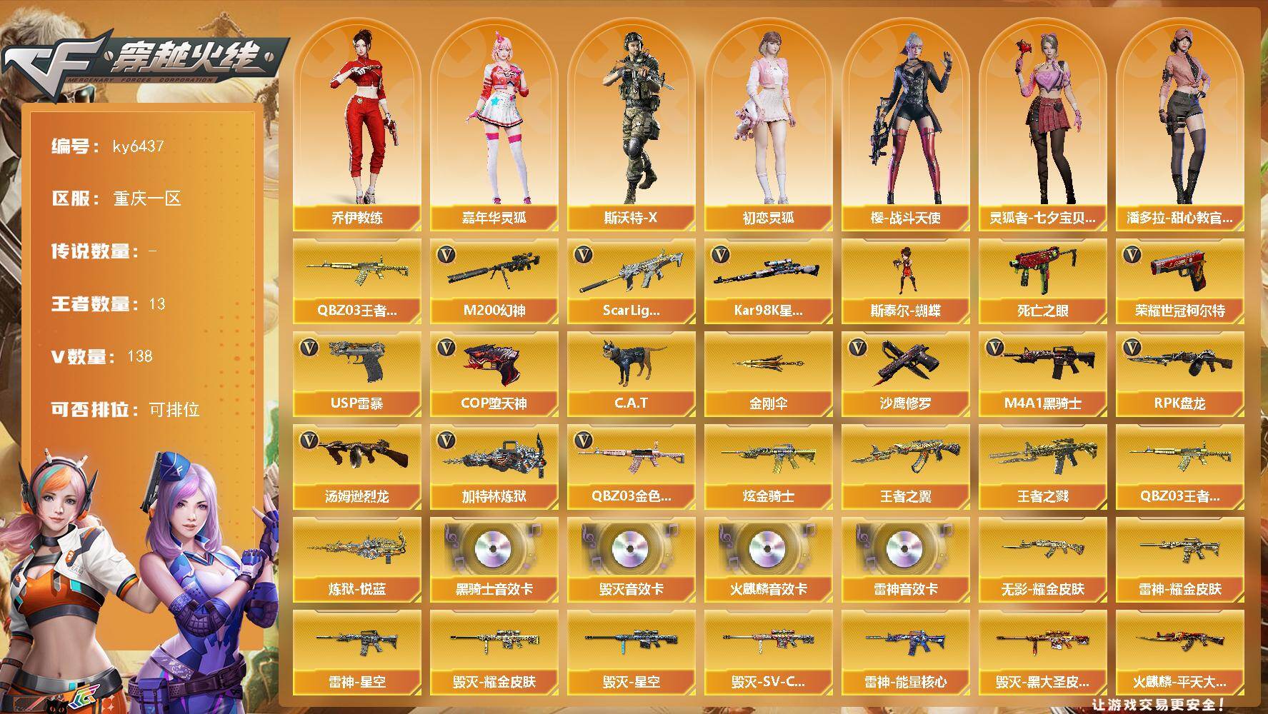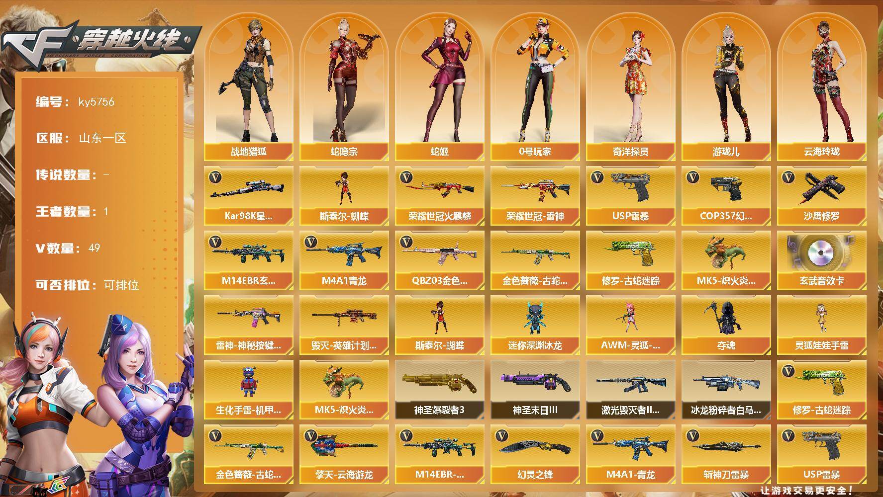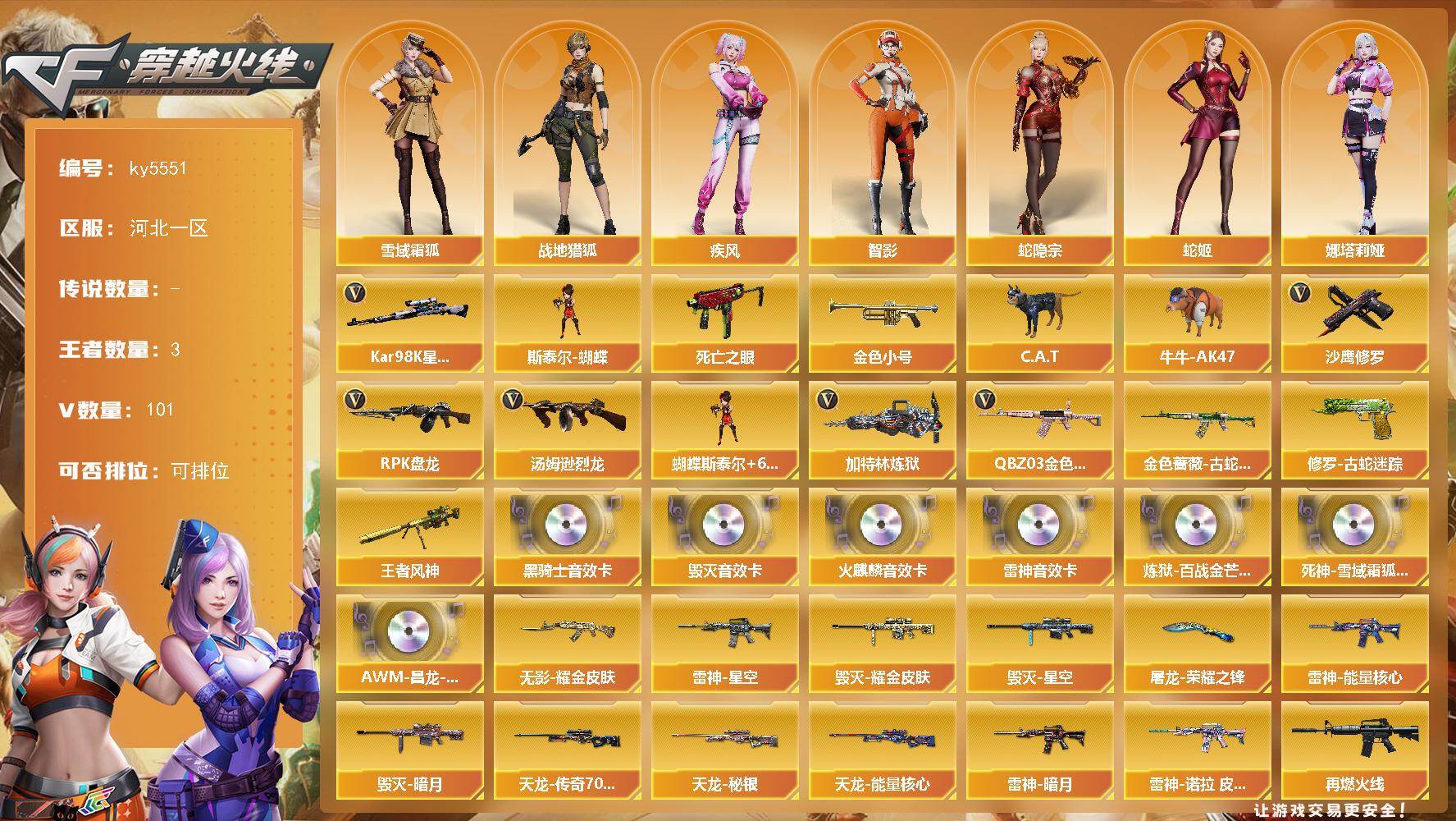 3传说武器 6王者武器 4炫金武器 209V武器 7V角色 44皮肤 可排位