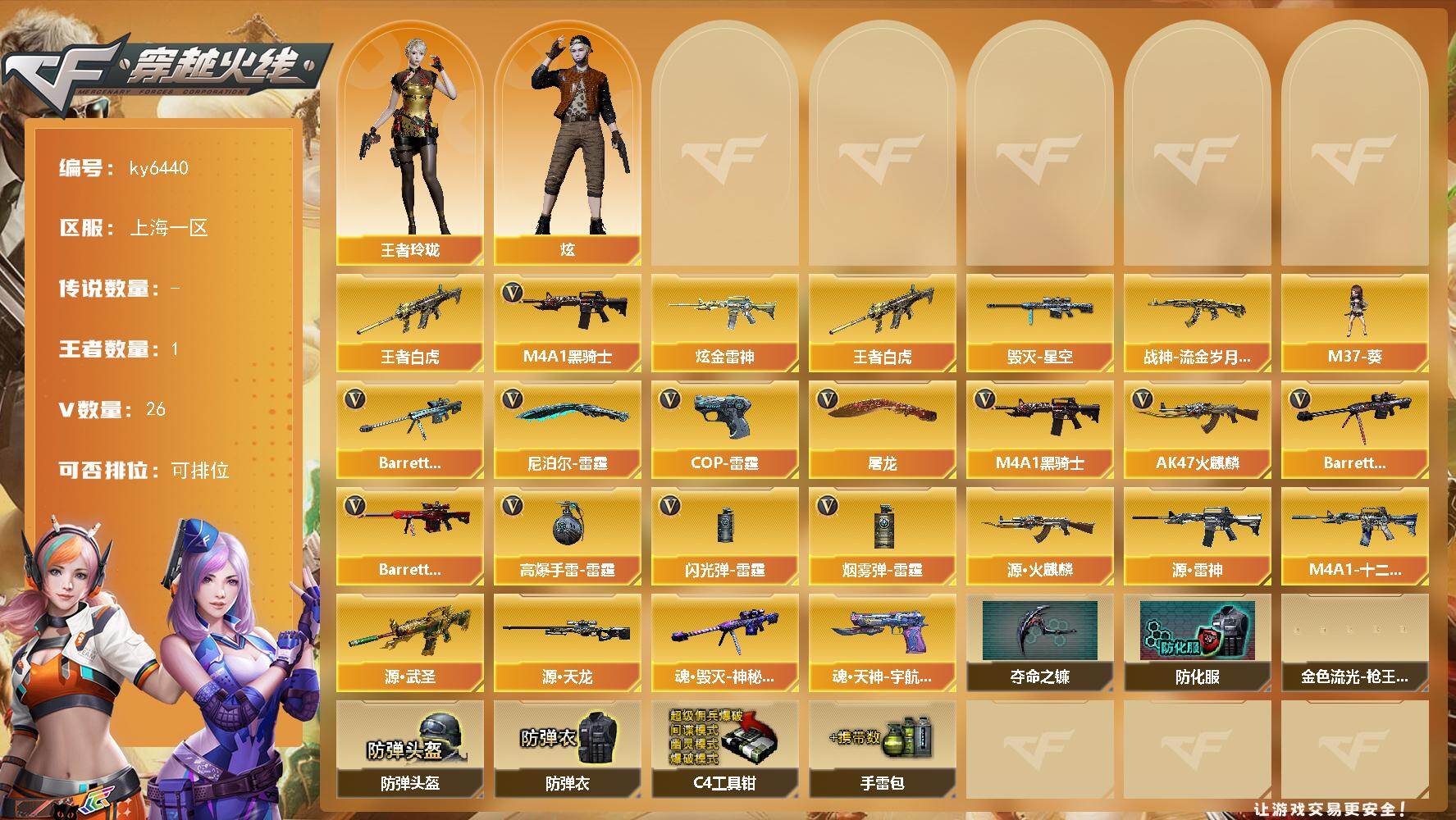 上海一区-26V-1王者武器数-1炫金武器数【热门武器】:王者白虎,M4A1