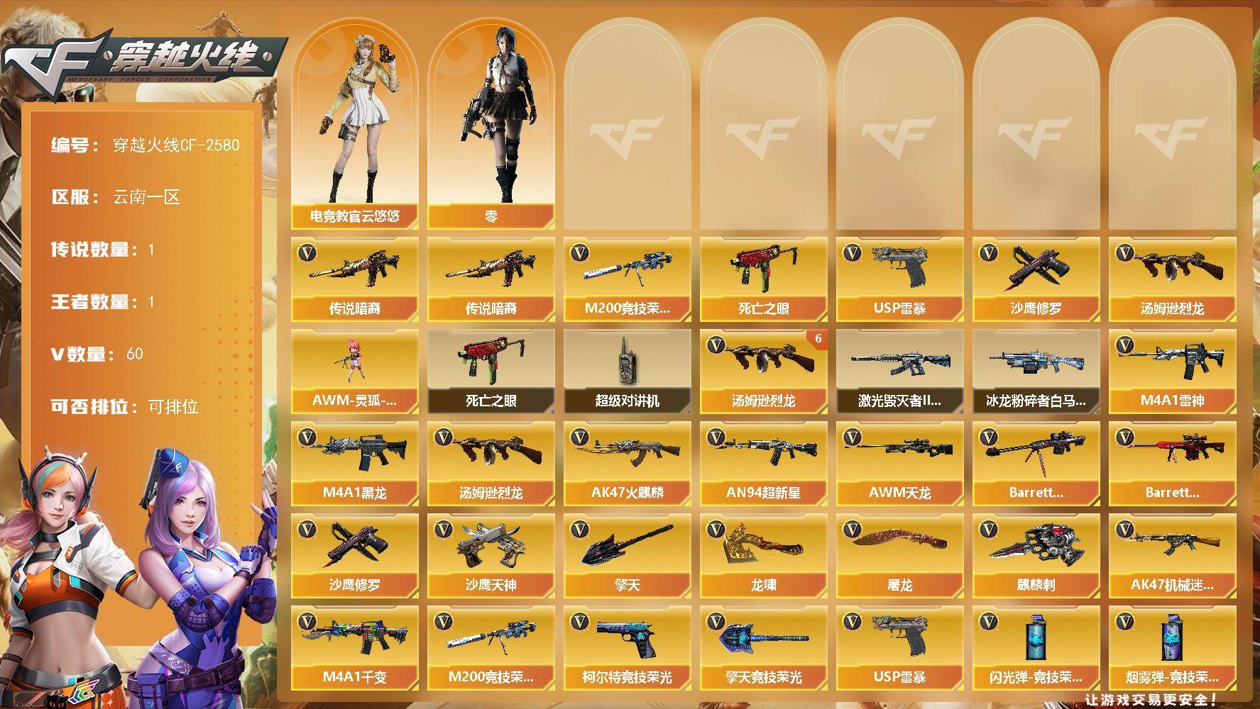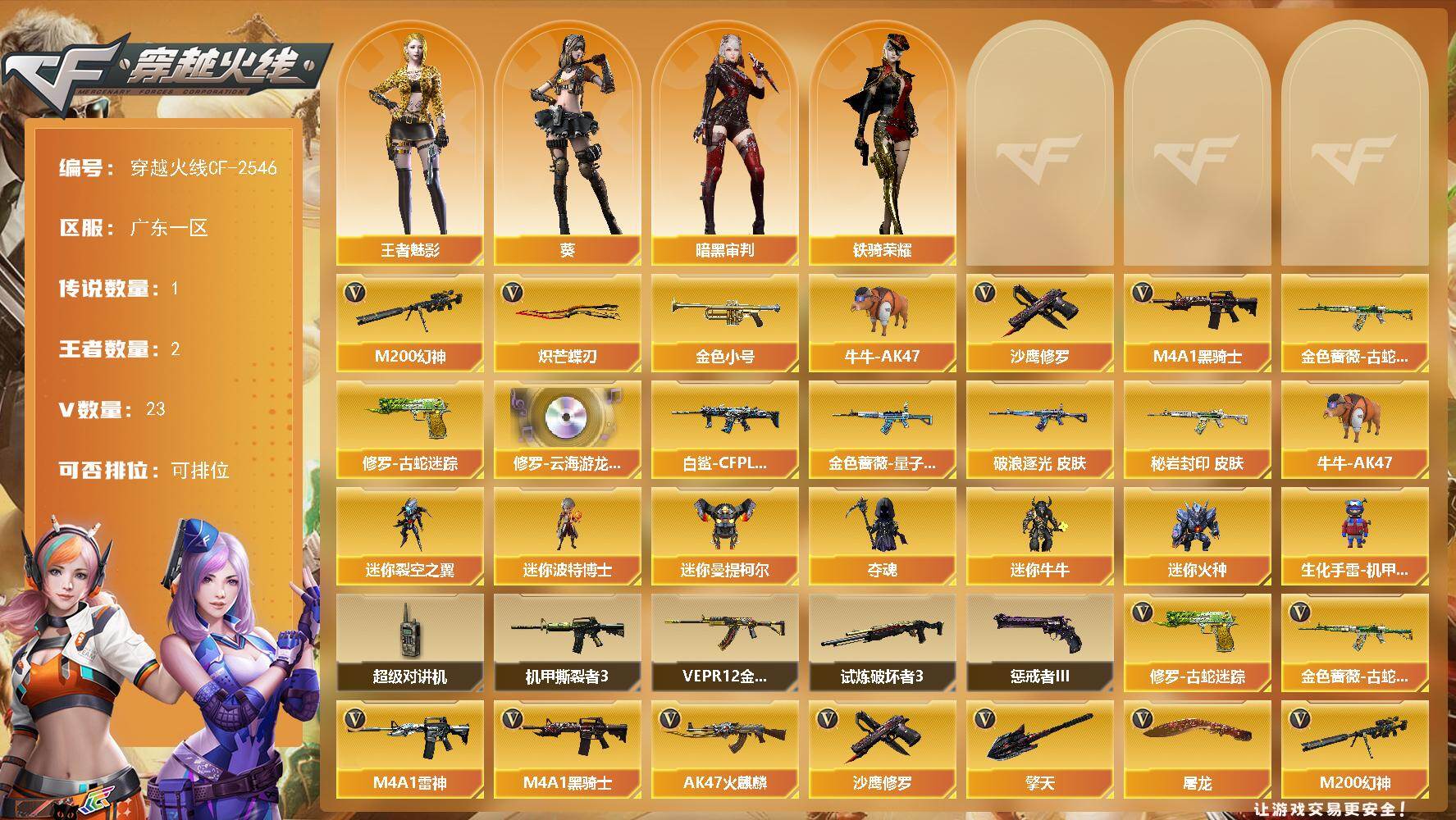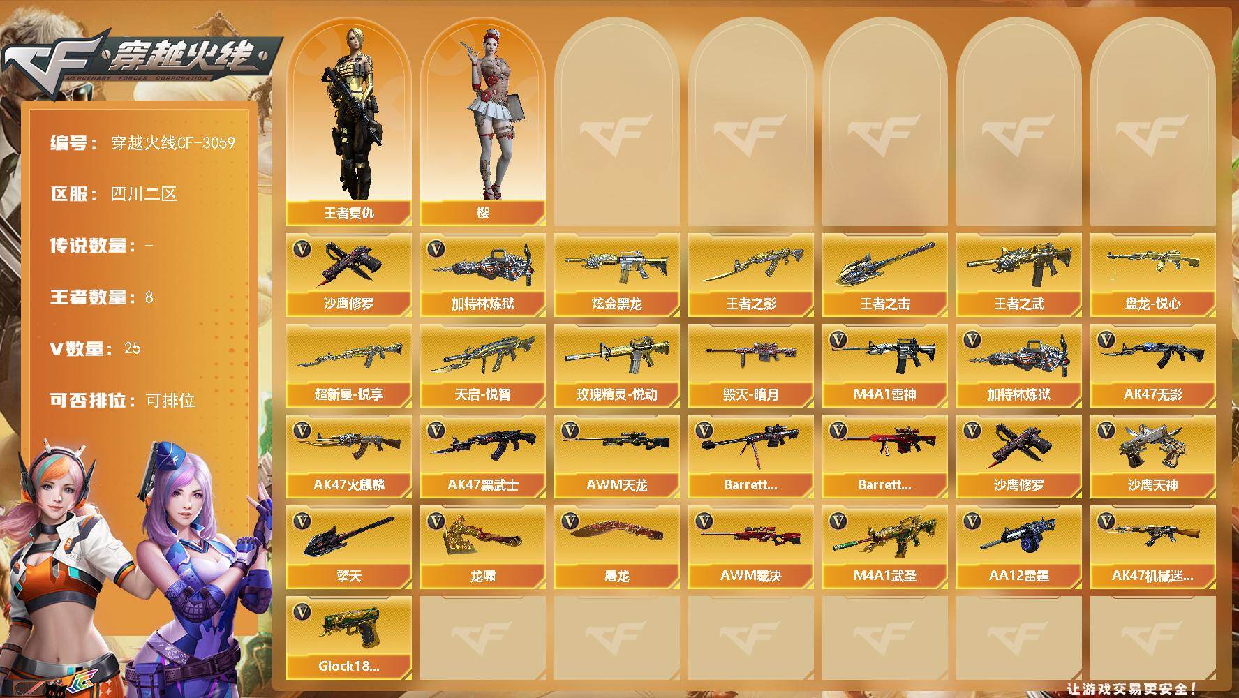 四川二区-25V-8王者-1炫金【热门武器】:加特林-炼狱*4,沙鹰-修罗*
