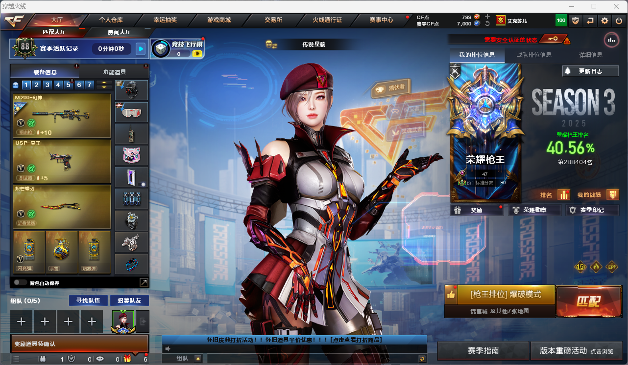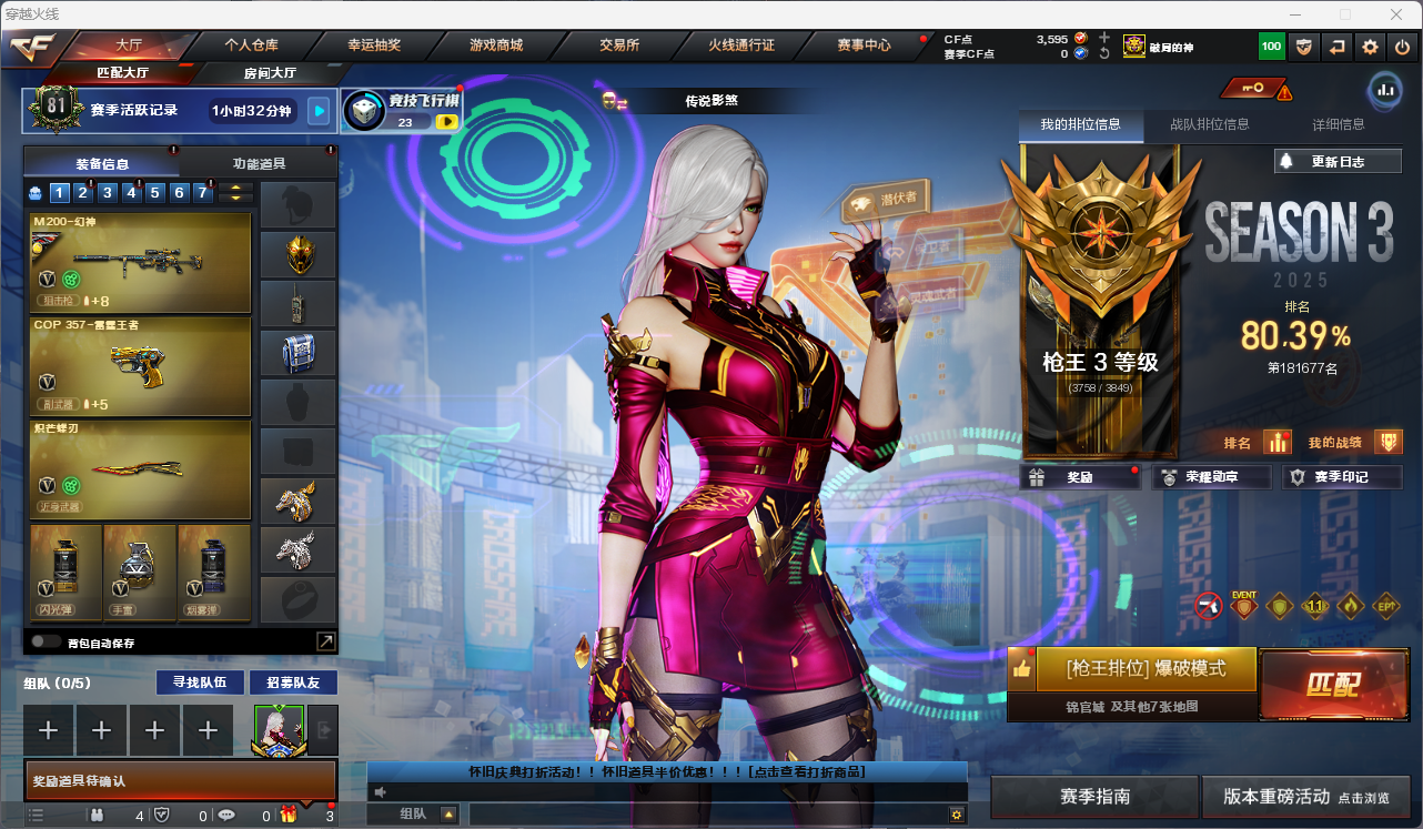 Lv.102段位宗师1,VIP5,87V,1传说,3王者,5炫金,664651CF点