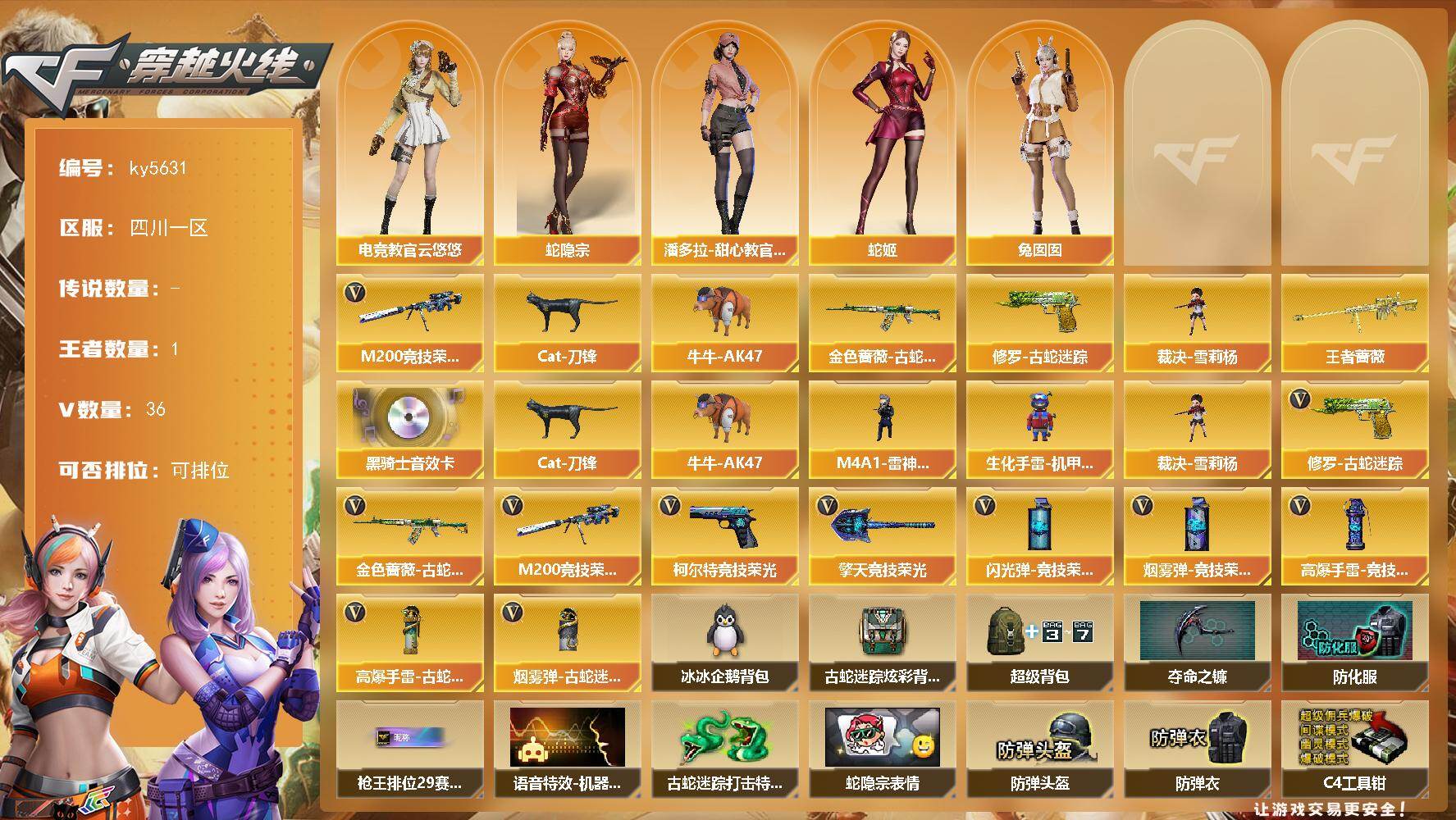四川一区-33V-1王者武器数-0炫金武器数【热门武器】:金色蔷薇-古蛇迷踪