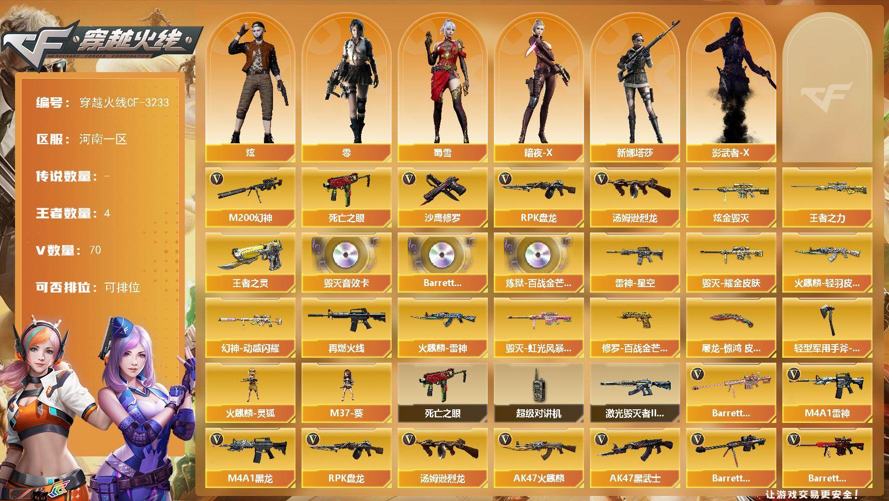 河南一区-70V-4王者-2炫金【热门武器】:M200-幻神,死亡之眼,汤姆