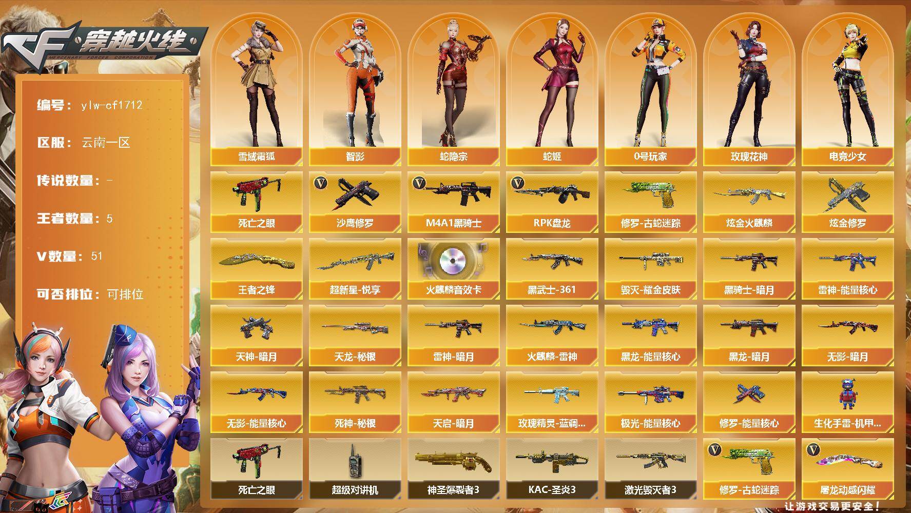云南一区-51V-5王者-3炫金【热门武器】:修罗-古蛇迷踪,死亡之眼*4