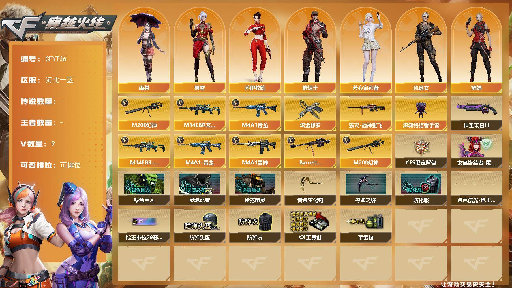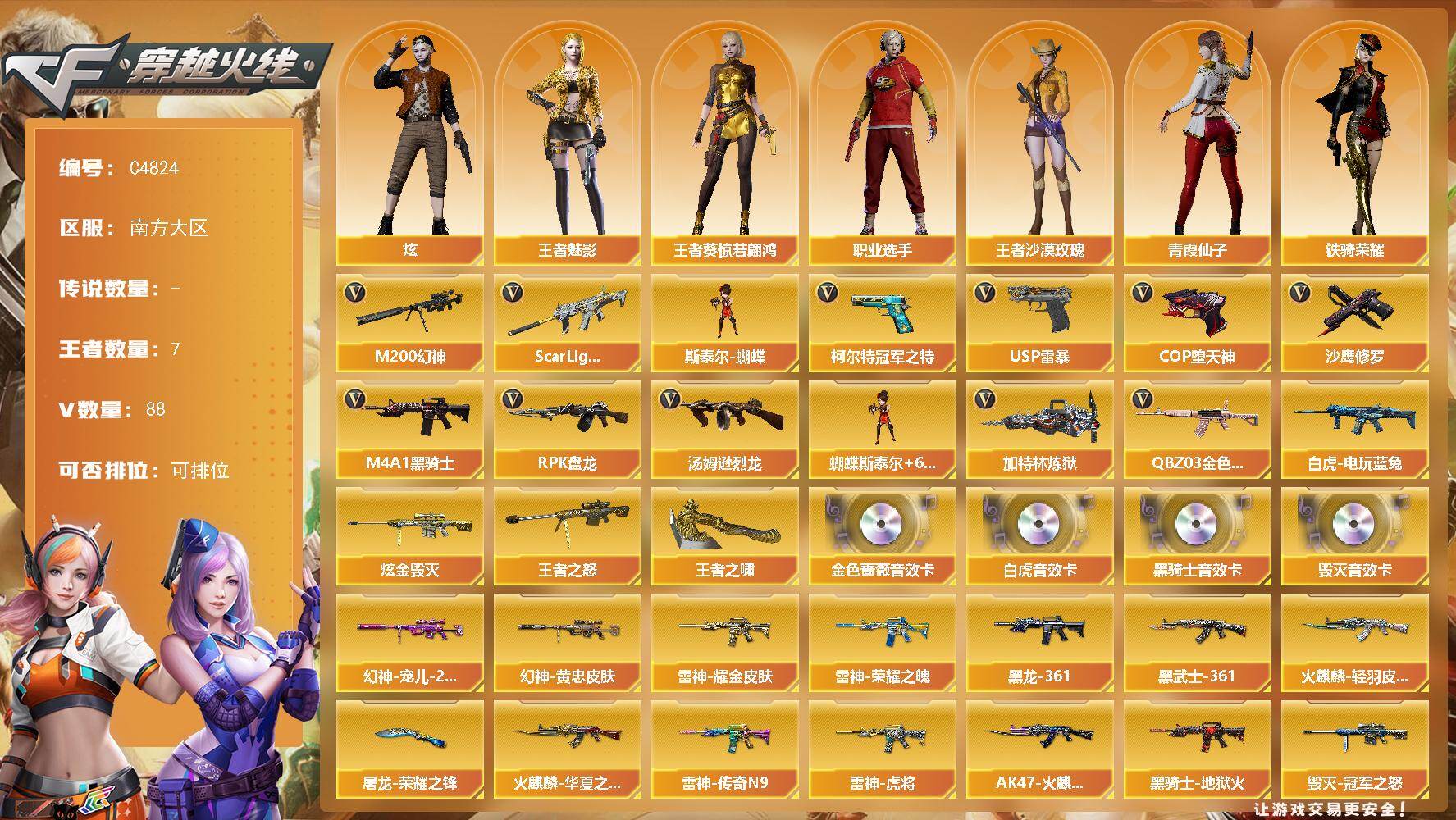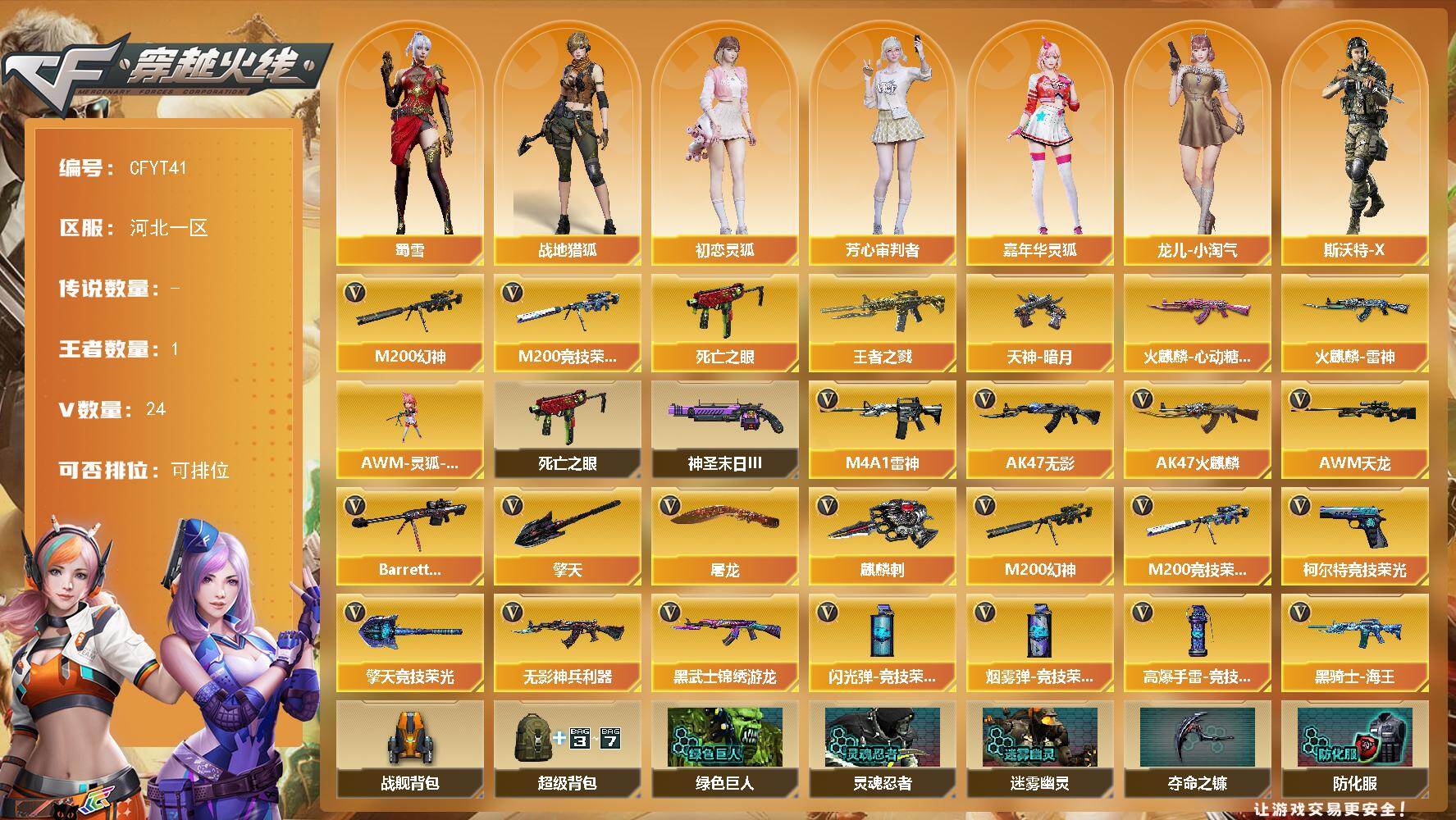 7V/79级/将帅/1炫金/2英雄/M14EBR-玄武/M4A1_青龙/M200_幻神
