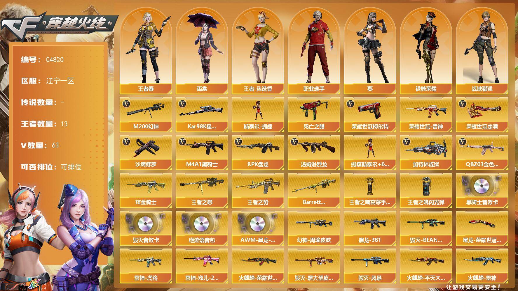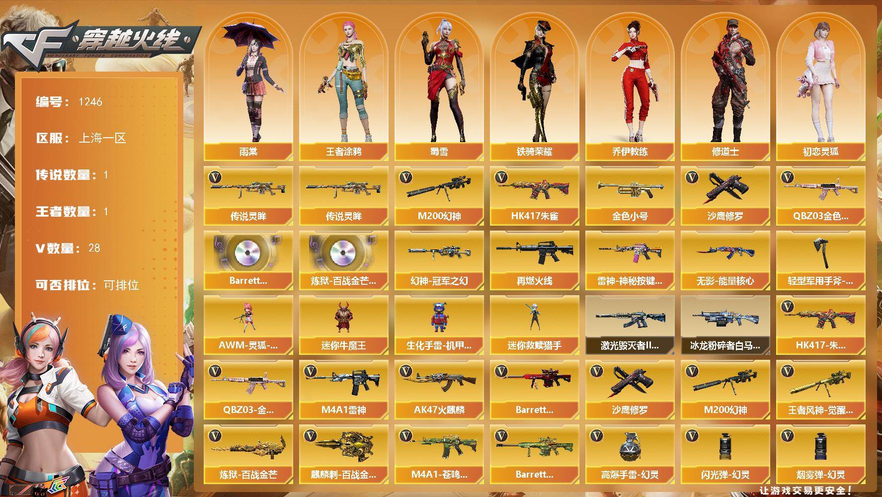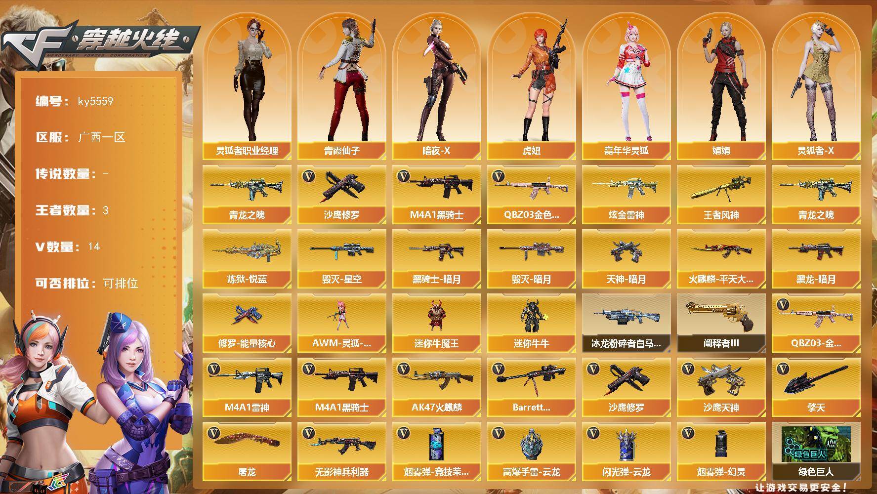 7V/79级/将帅/1炫金/2英雄/M14EBR-玄武/M4A1_青龙/M200_幻神