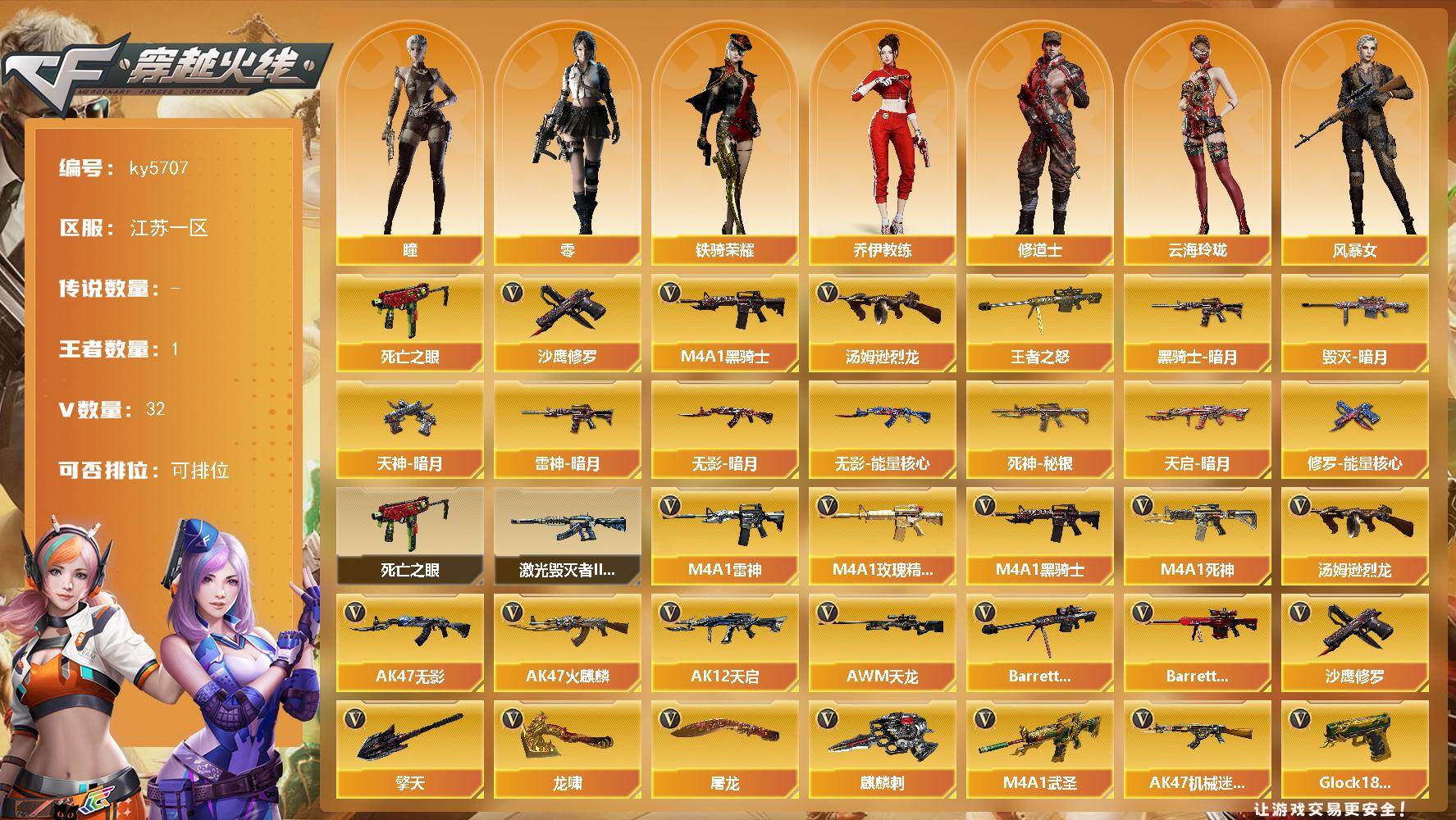 江苏一区-32V-1王者武器数-0炫金武器数【热门武器】:死亡之眼*2,M4