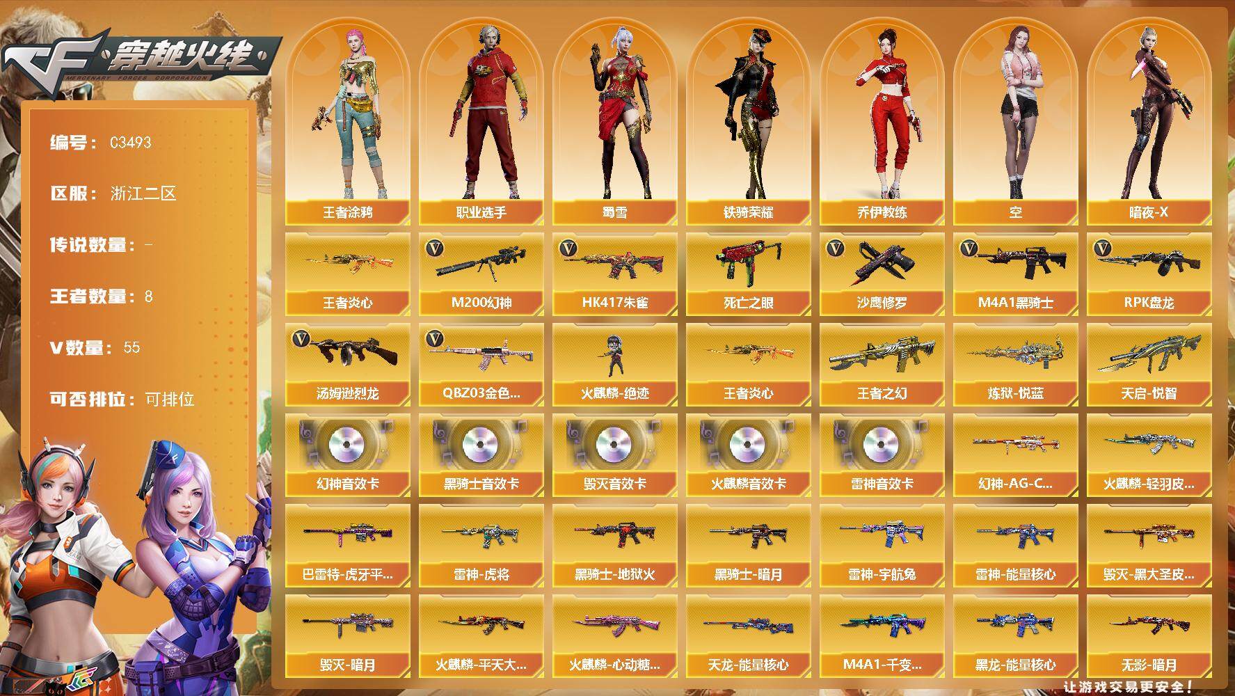 【商品标题】:广东一区-55V-3王者-0炫金【热门武器】:M200-竞技荣