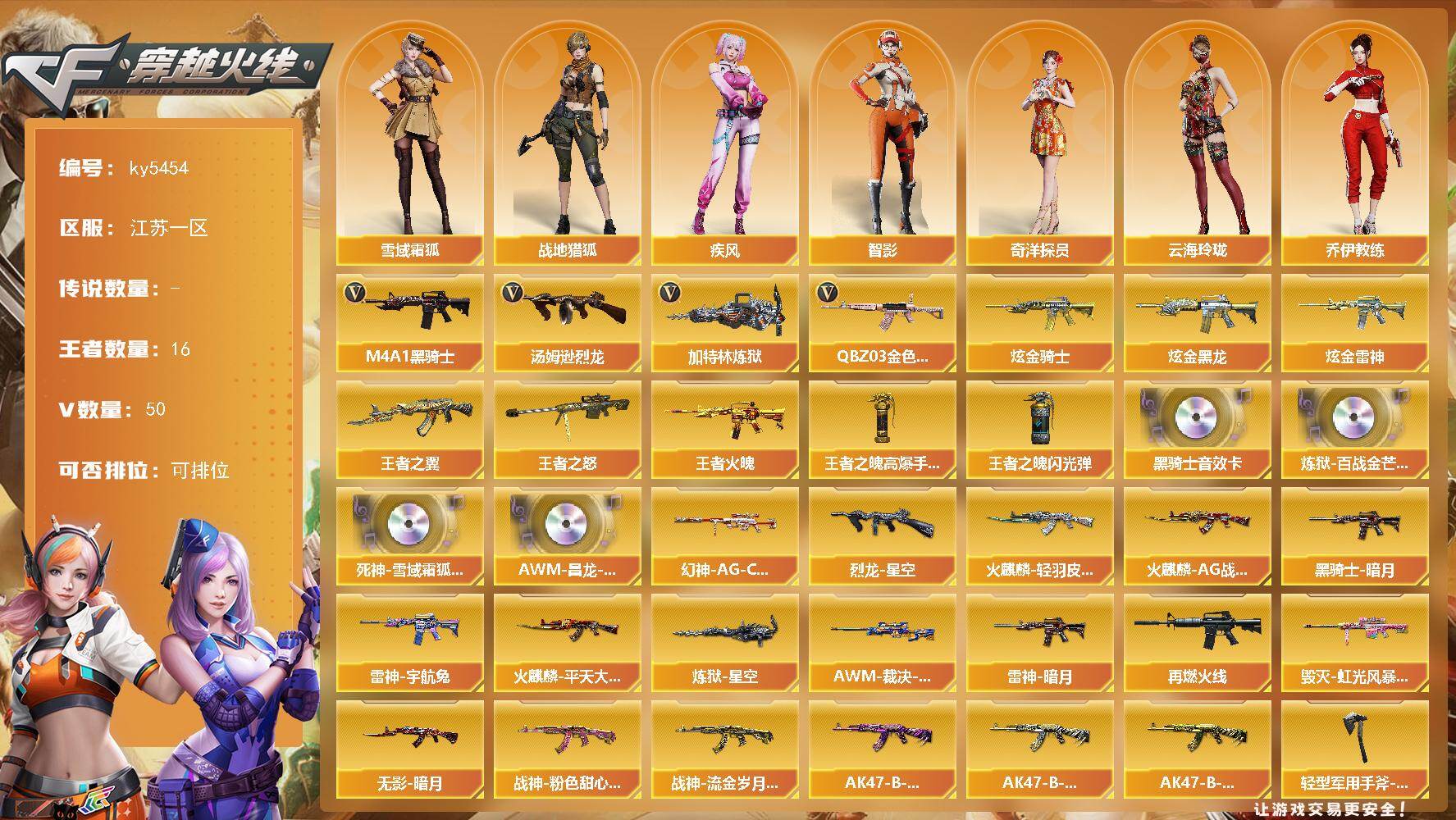 江苏一区-56V-16王者武器数-5炫金武器数【传说角色】:传说星骇