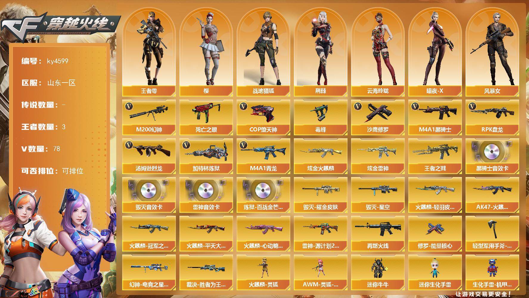 山东一区-78V-3王者-2炫金【热门武器】:M4A1-青龙,M200-幻神
