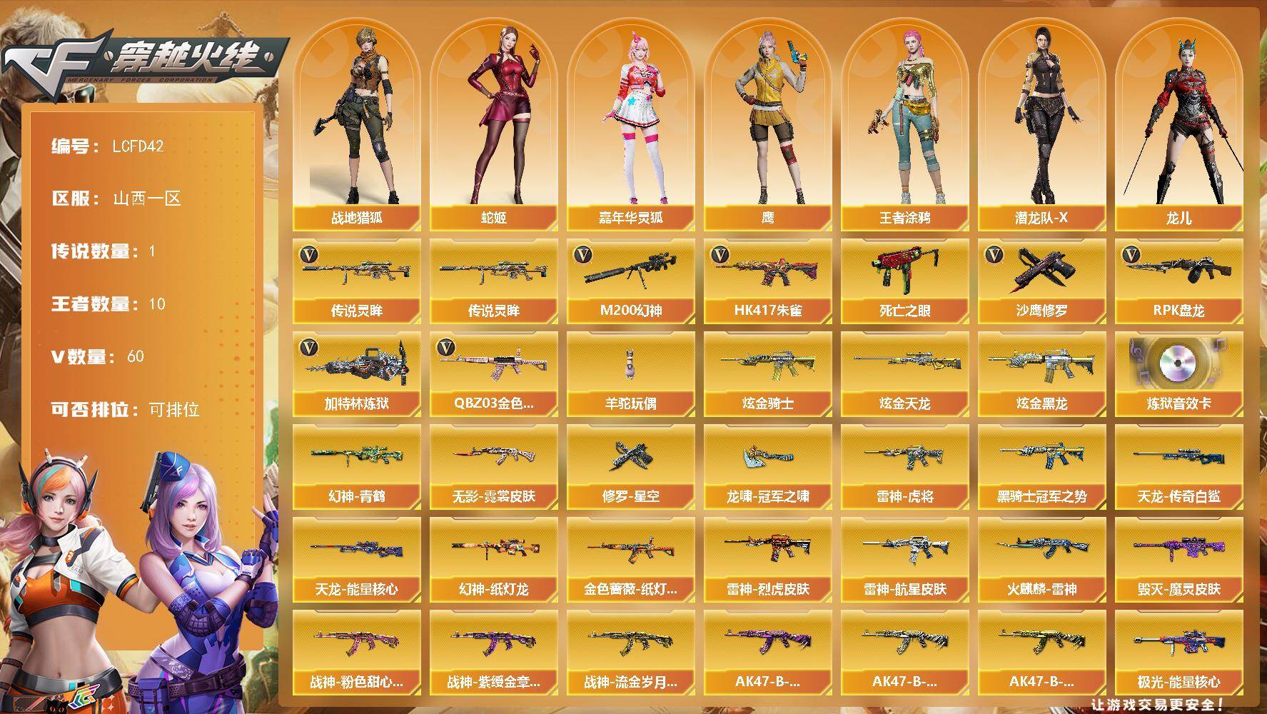 幻神双皮!1传说灵眸!山西一区-70V-10王者武器数-4炫金武器数