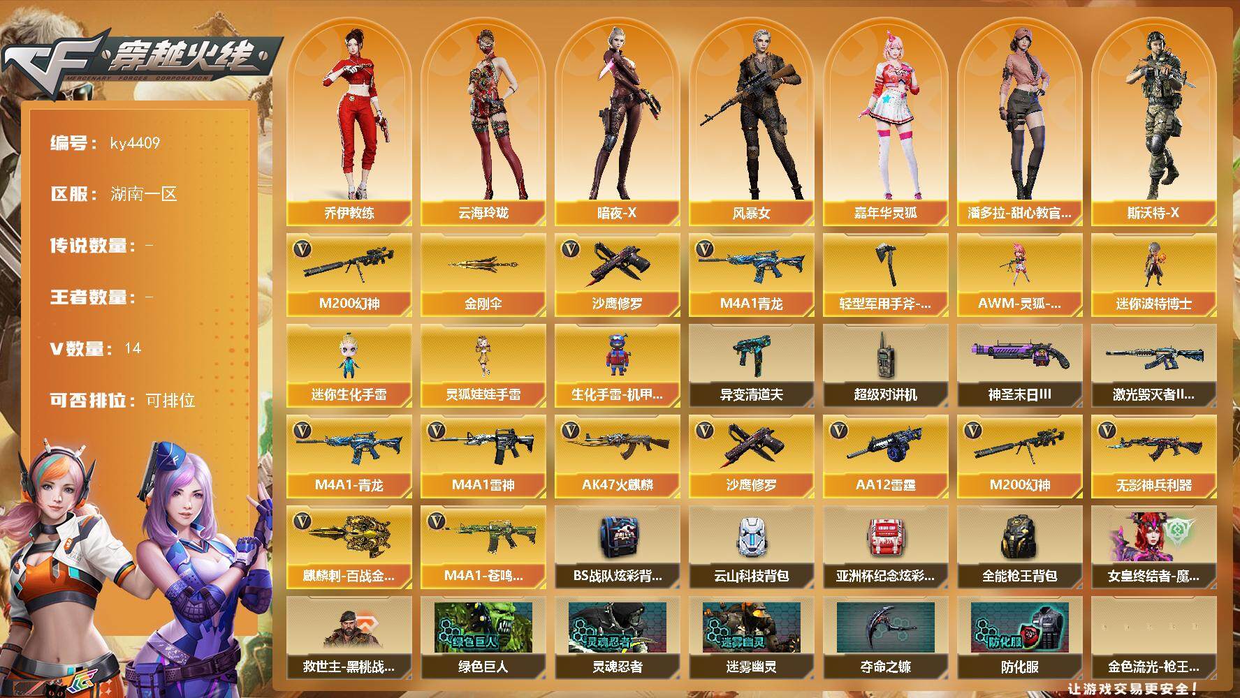 湖南一区-14V-0王者-0炫金【热门武器】:M4A1-青龙,M200-幻神