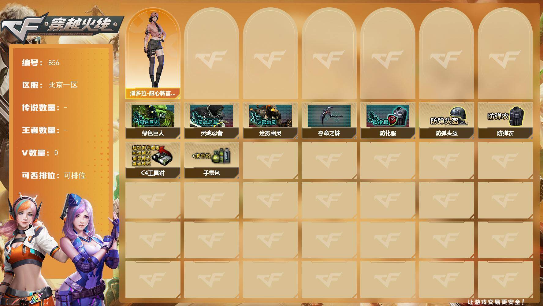 北京一区-0V-0王者-0炫金【角色】:潘多拉-甜心教官【道具】:绿色巨人
