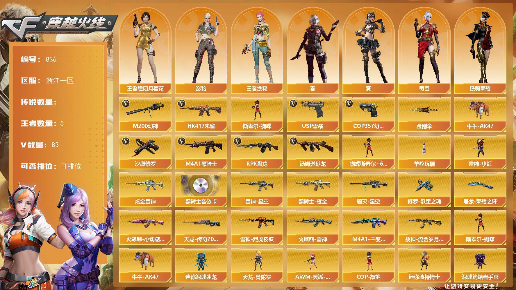 浙江一区-83V-5王者-1炫金【热门武器】:HK417-朱雀,M200-幻