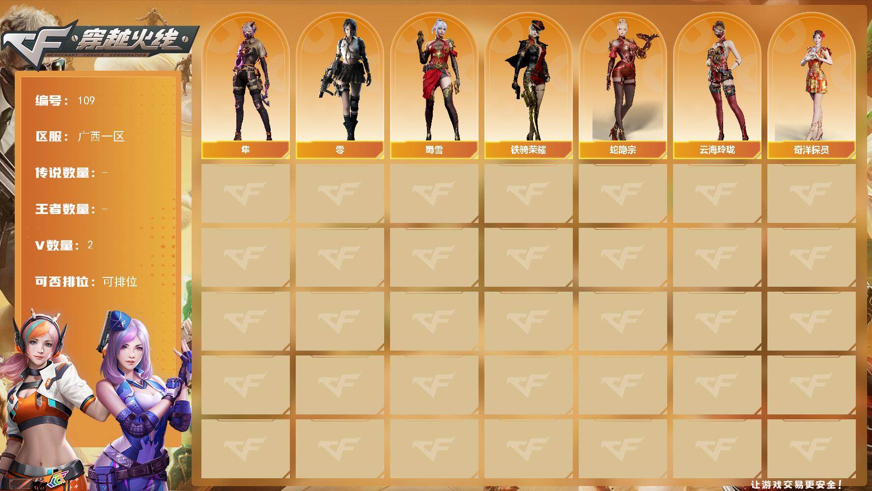 广西一区-2V-0王者-0炫金【角色】:零,隼,蛇隐宗,奇洋探员,云海玲珑,