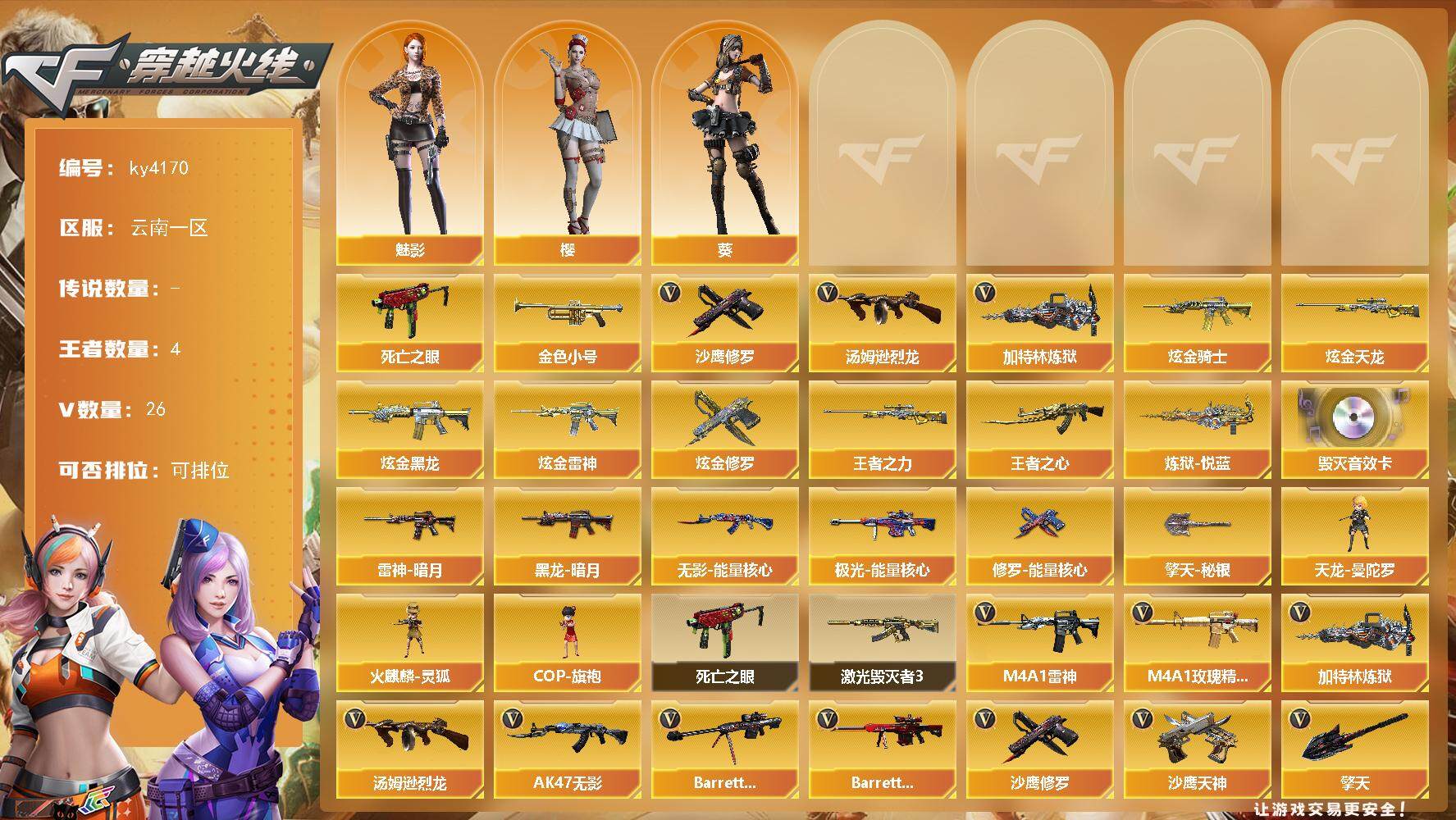 云南一区-26V-4王者-5炫金【热门武器】:死亡之眼*3,金色小号,汤姆逊