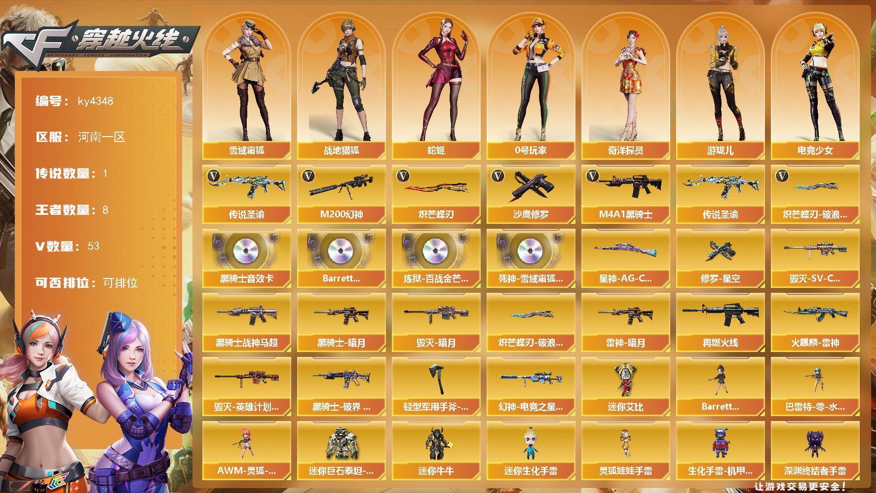 3传说武器 6王者武器 4炫金武器 209V武器 7V角色 44皮肤 可排位