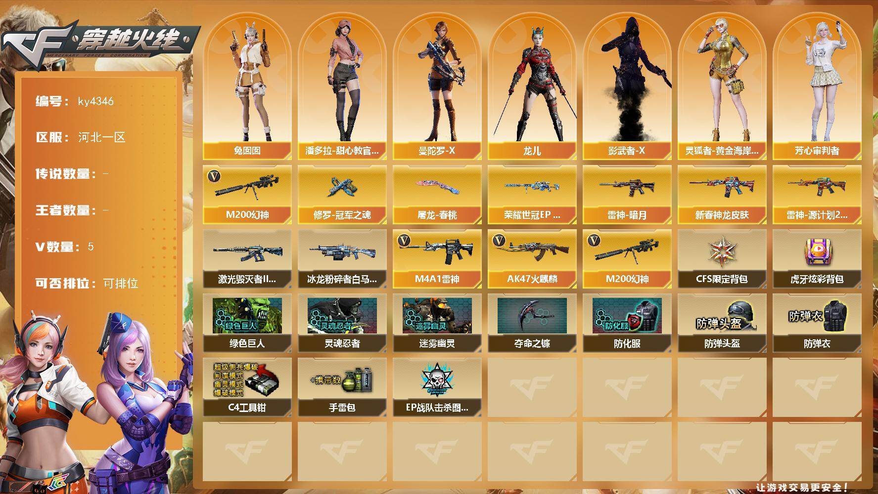 河北一区-5V-0王者-0炫金【热门武器】:M200-幻神【皮肤】:幻神-