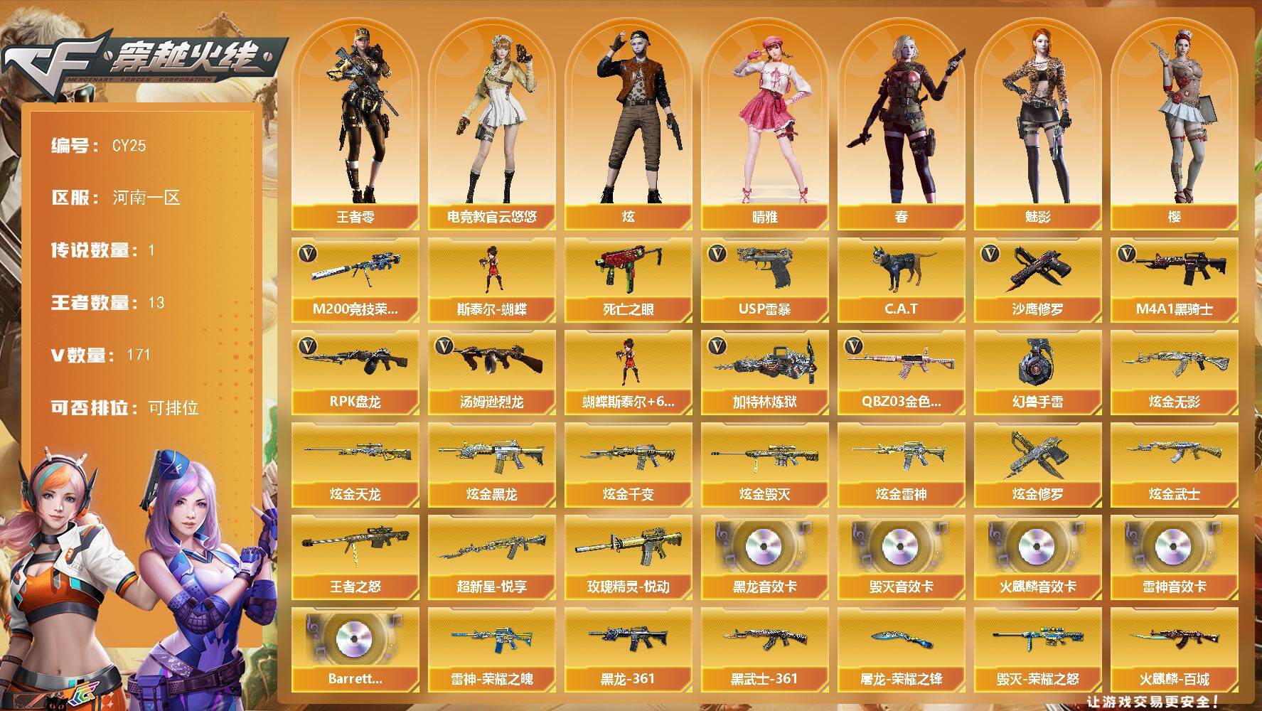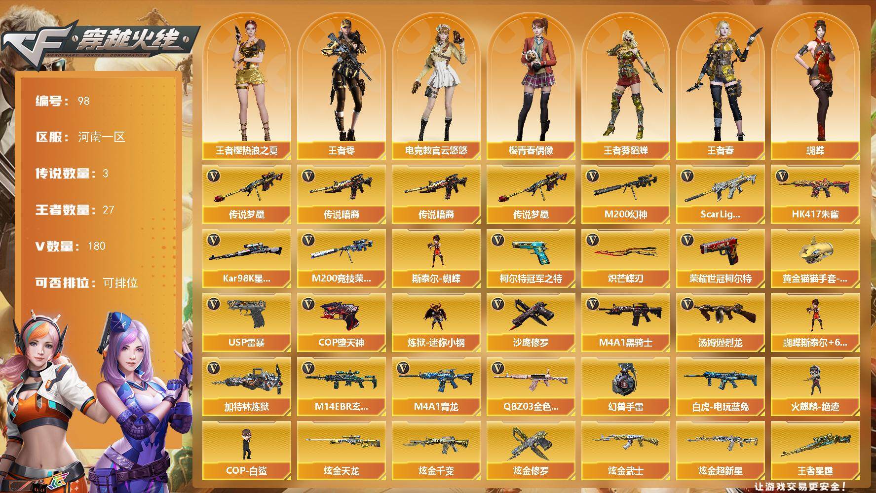 河南一区-176V-33王者-11炫金【传说武器】:传说光耀【传说角色】: