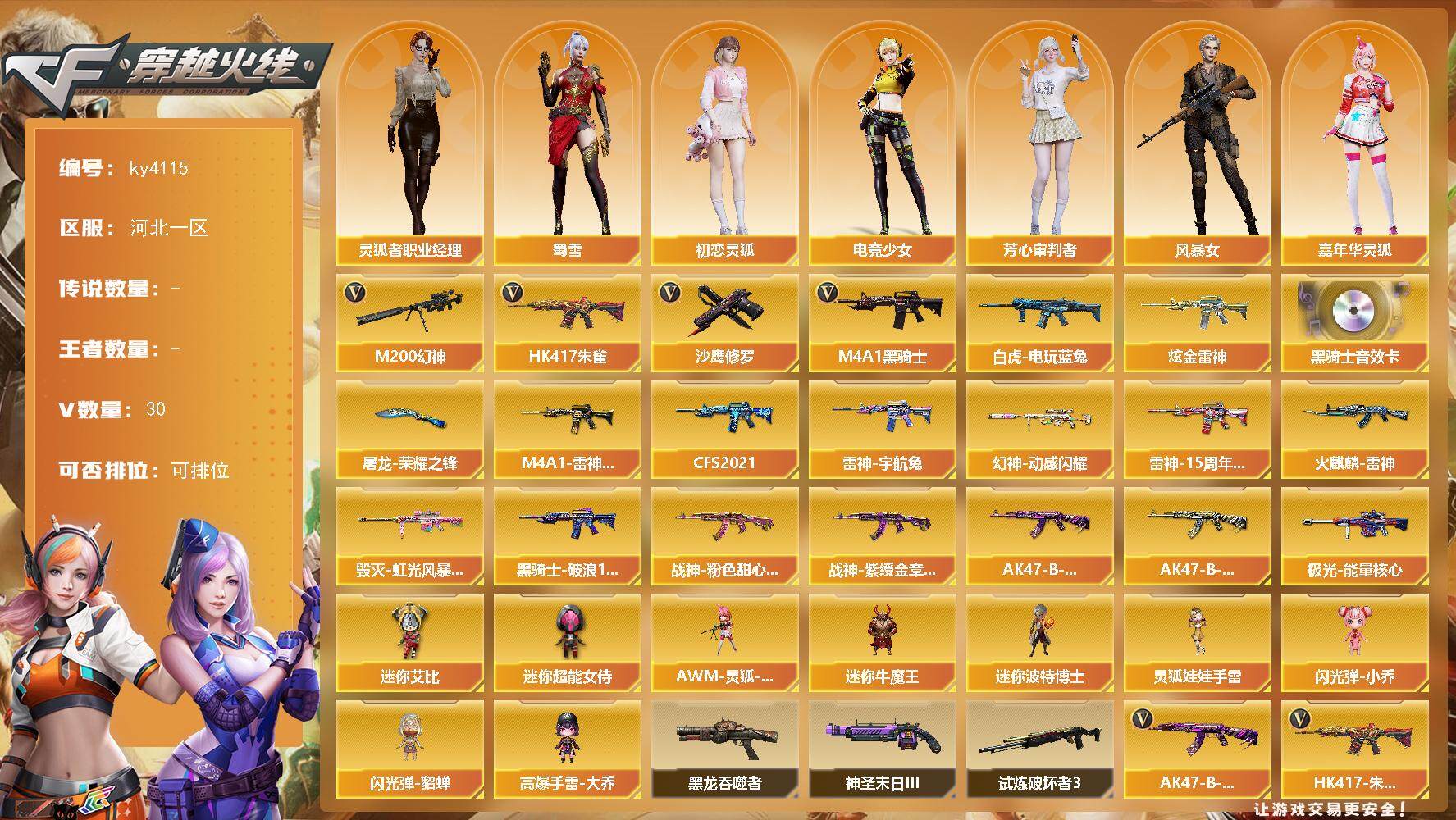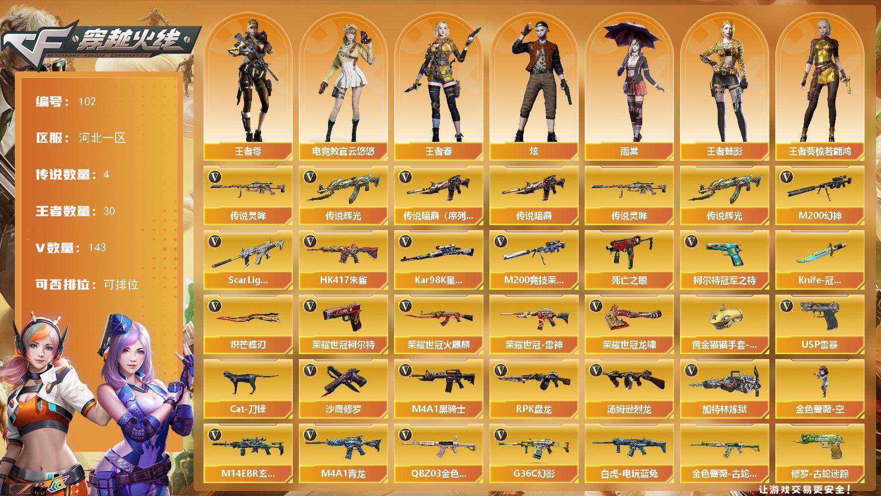 河北一区-30V-0王者-1炫金【热门武器】:HK417-朱雀,M200-幻