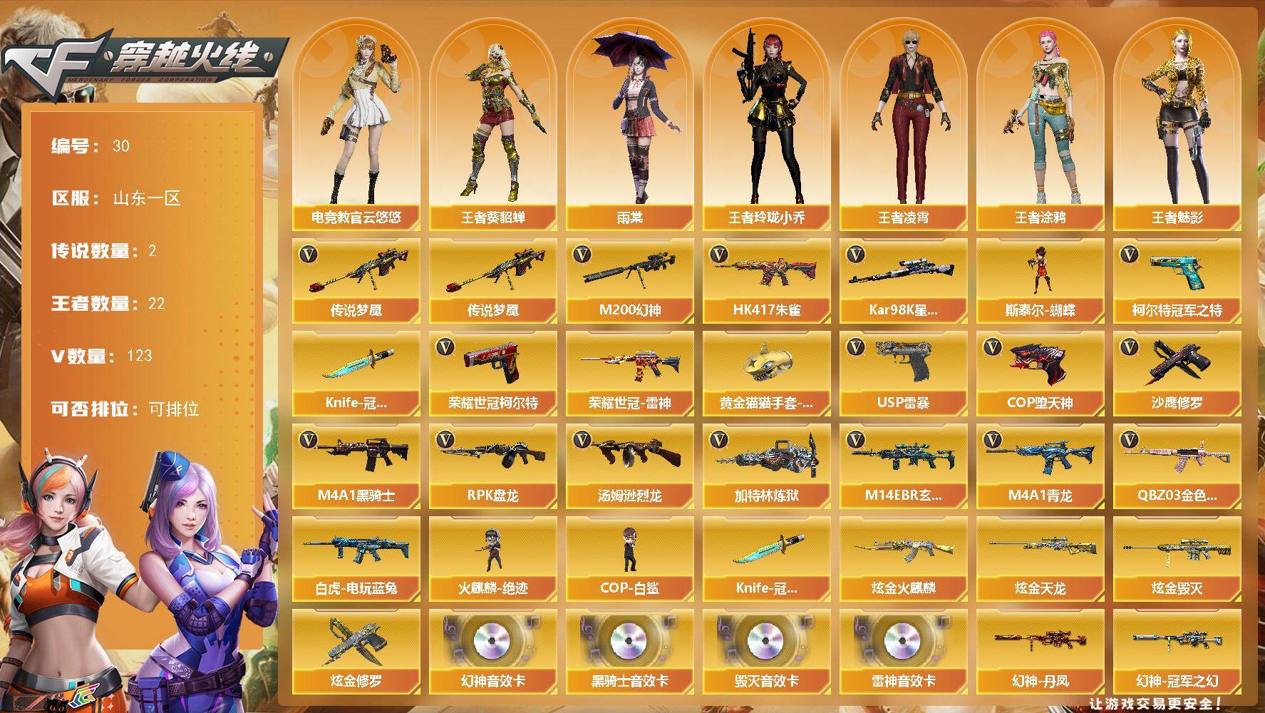 山东一区-123V-22王者-4炫金【传说武器】:传说梦魇【传说角色】:传