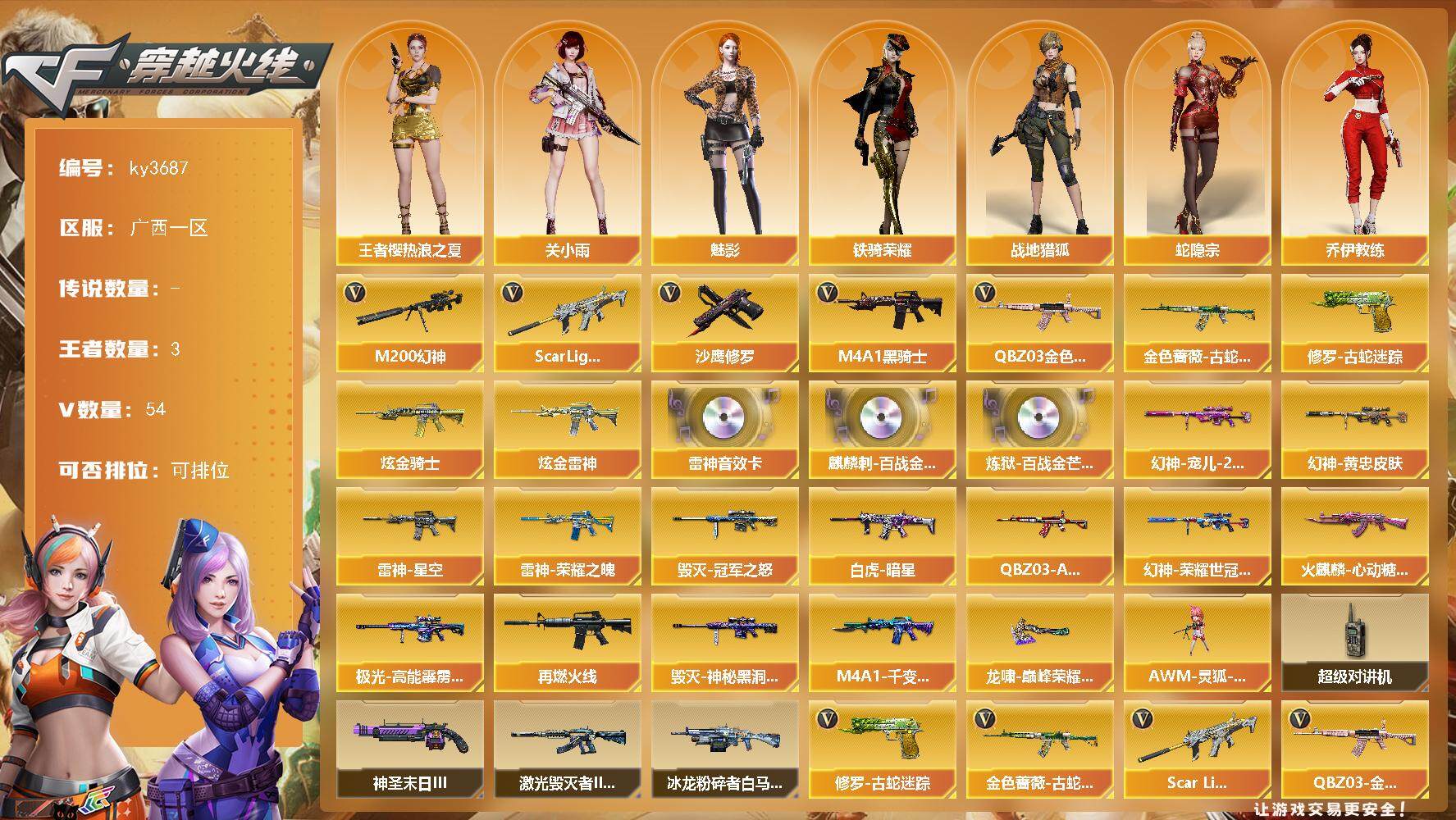 广西一区-54V-3王者-2炫金 【热门武器】:QBZ03-金色蔷薇,Scar