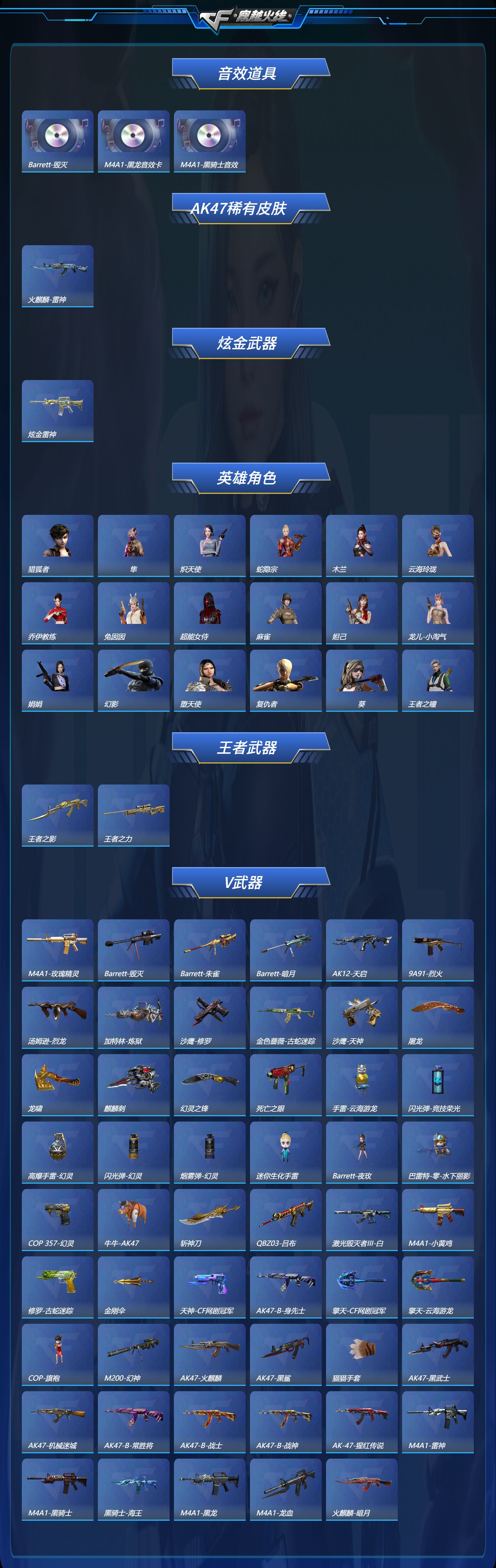 王者蔷薇,毁灭,极光,炼狱,AK机械迷城,苍鸣雷神,龙啸,麒麟刺,擎天,M4a 1再燃火线,金色蔷薇