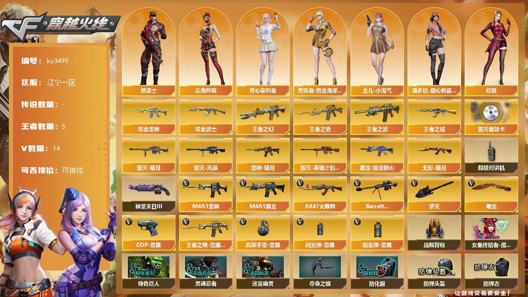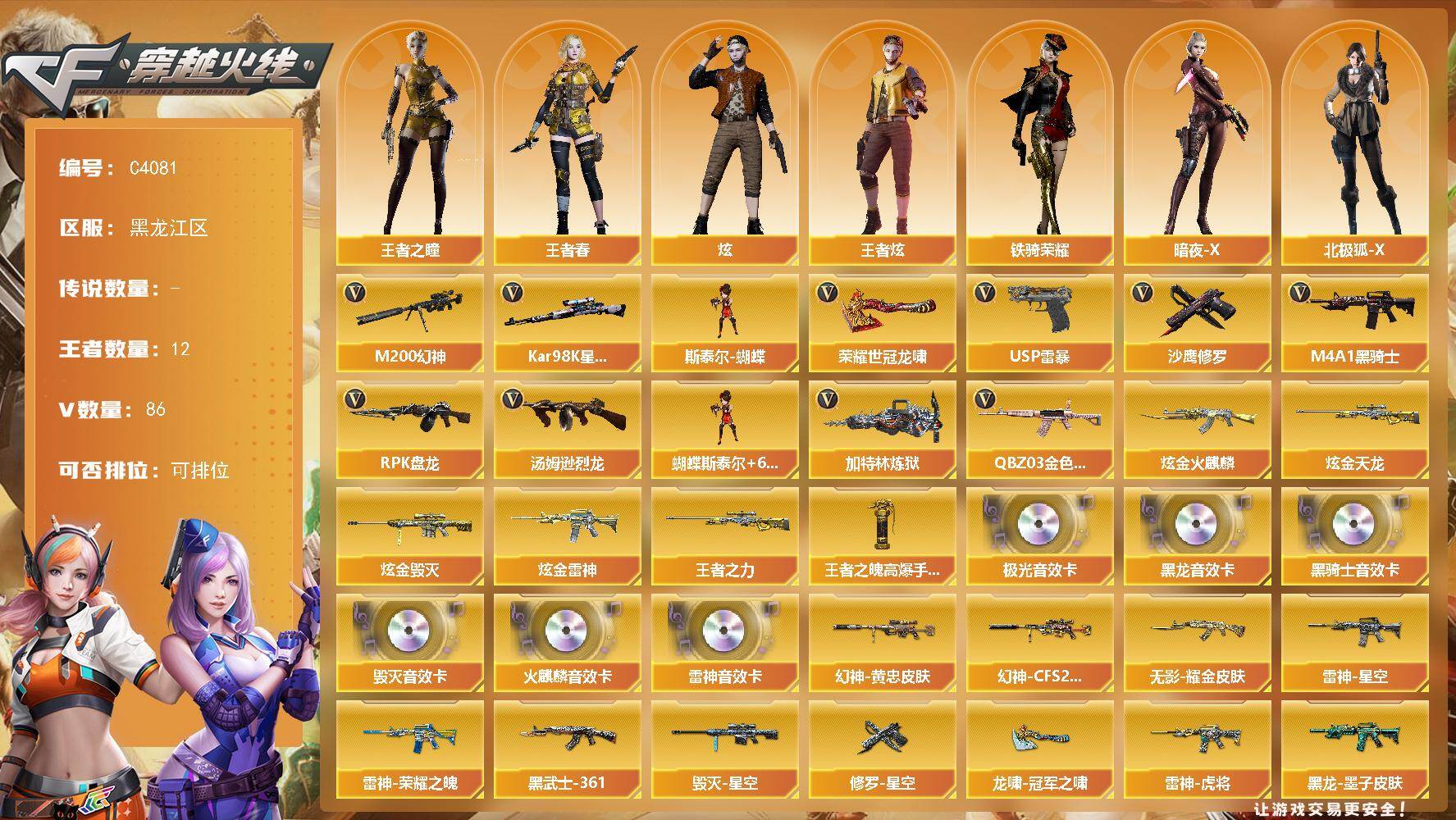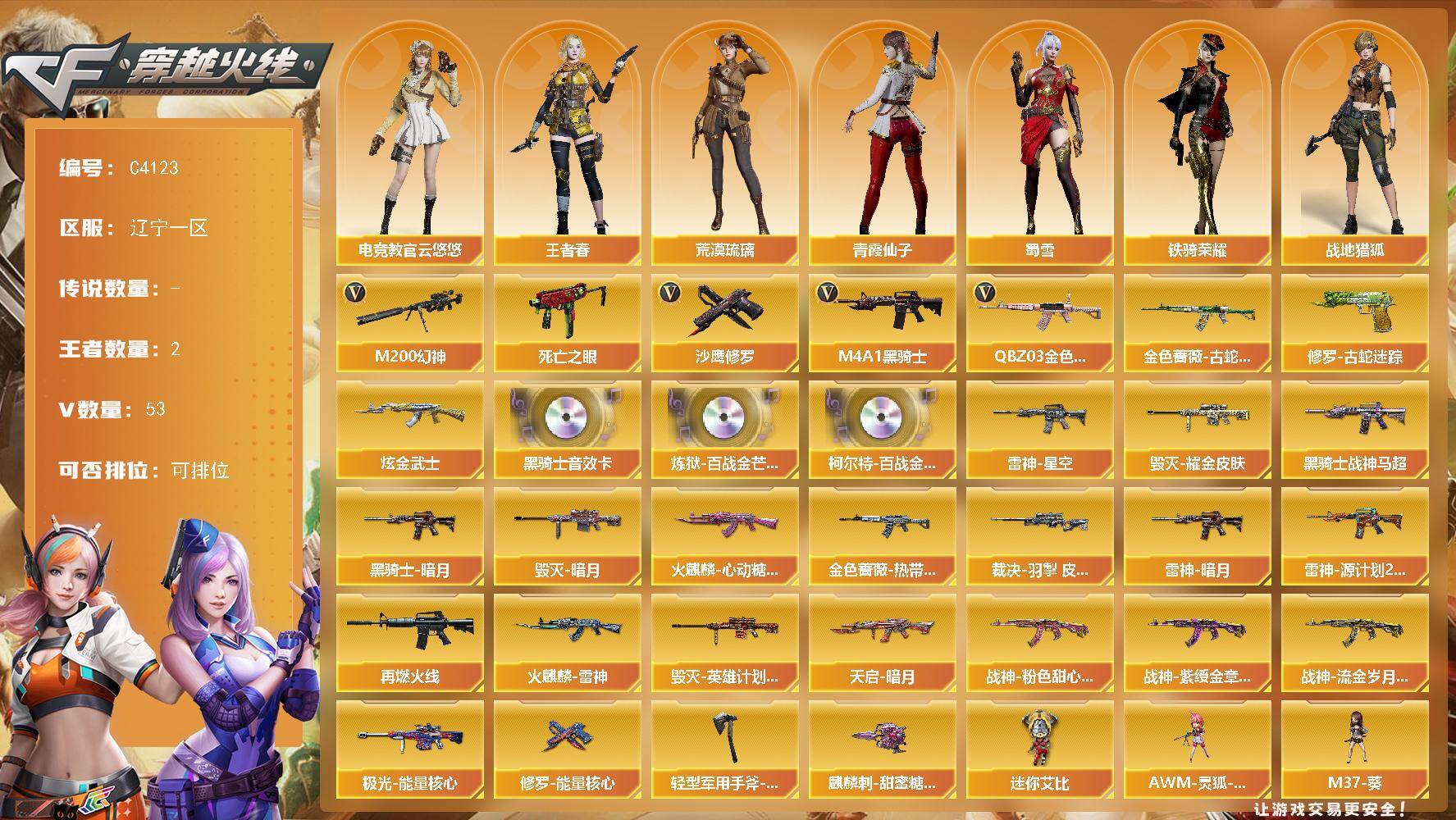 辽宁一区-53V-2王者-1炫金【热门武器】:QBZ03-金色蔷薇,M200