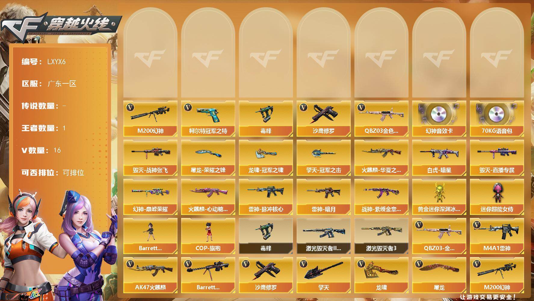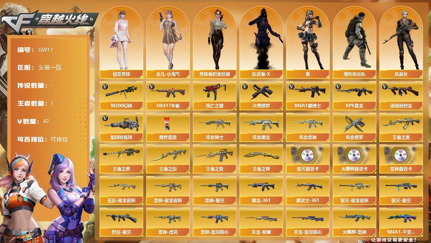 安徽一区-44V-7王者武器数-5炫金武器数【热门武器】:HK417-朱雀,