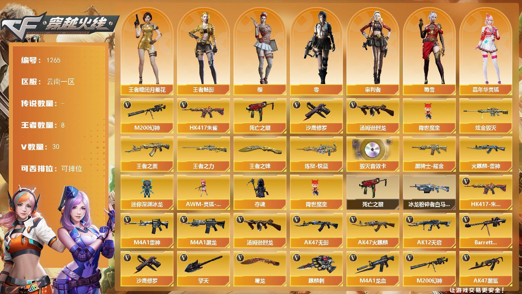 云南一区-30V-8王者-1炫金【热门武器】:HK417-朱雀,M200-幻