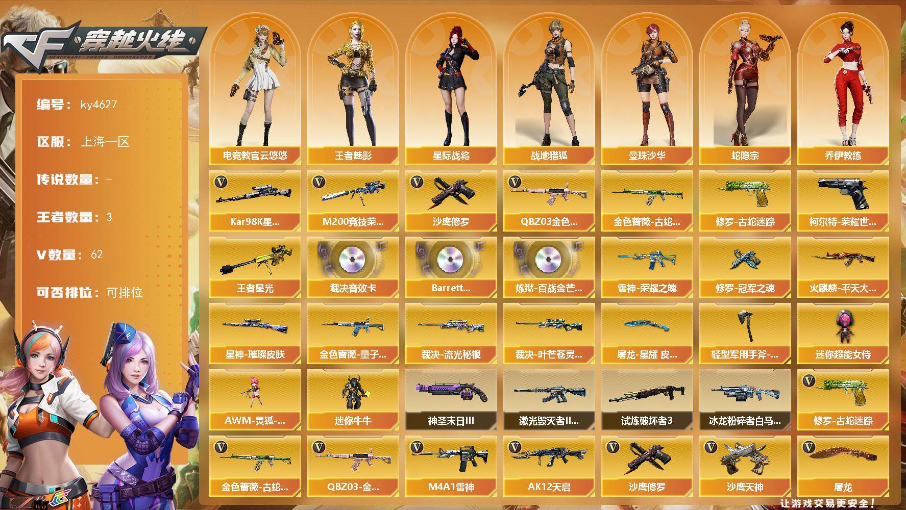 上海一区-62V-3王者-0炫金【热门武器】:QBZ03-金色蔷薇,柯尔特-