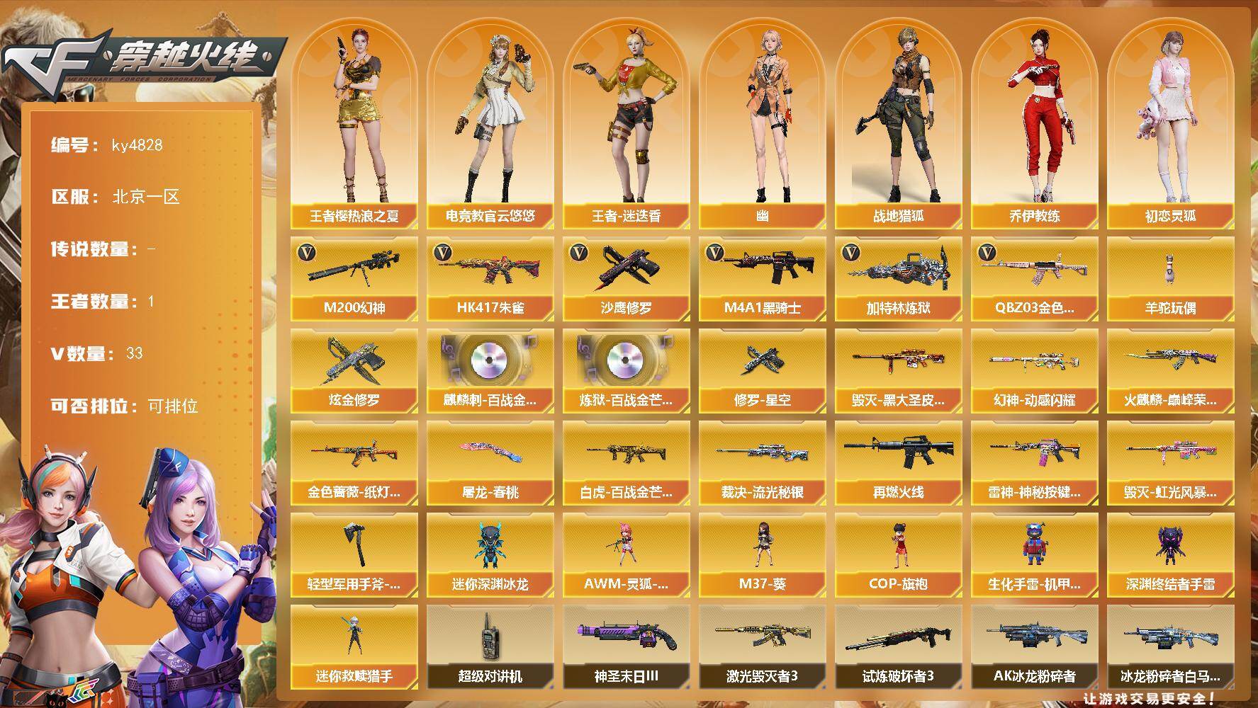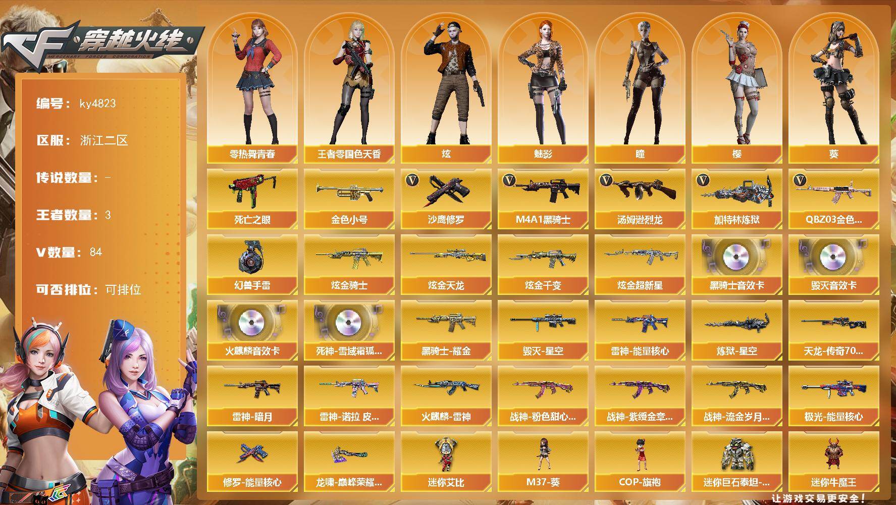 重庆一区-129V-18王者-4炫金【传说角色】:传说星骇【热门武器】:Q