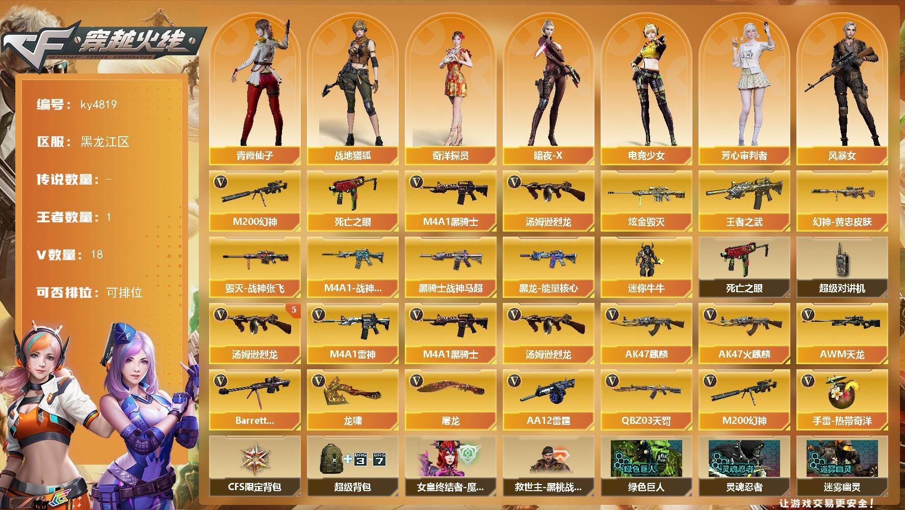 黑龙江区-18V-1王者-1炫金【热门武器】:M200-幻神,死亡之眼,M4