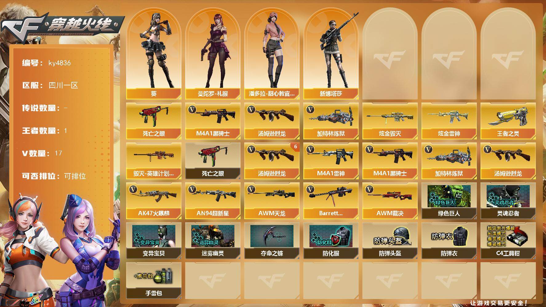 四川一区-17V-1王者-2炫金【热门武器】:死亡之眼,M4A1-黑骑士,汤