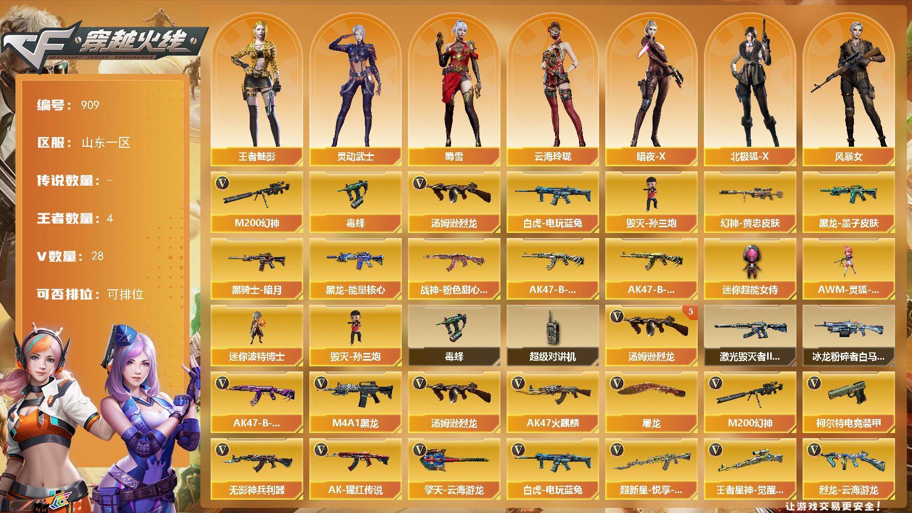 山东一区-28V-4王者-0炫金【热门武器】:M200-幻神,白虎-电玩蓝兔