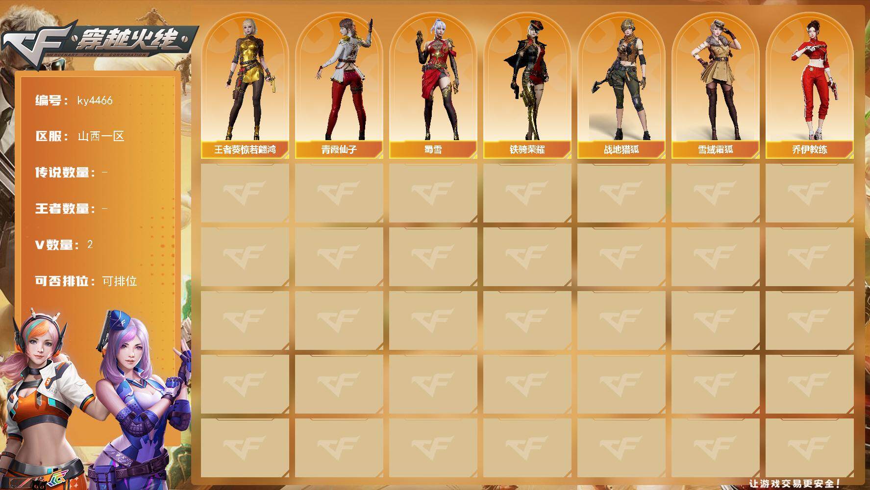 山西一区-2V-0王者-0炫金【角色】:战地猎狐,王者葵-惊若翩鸿,雪域霜狐
